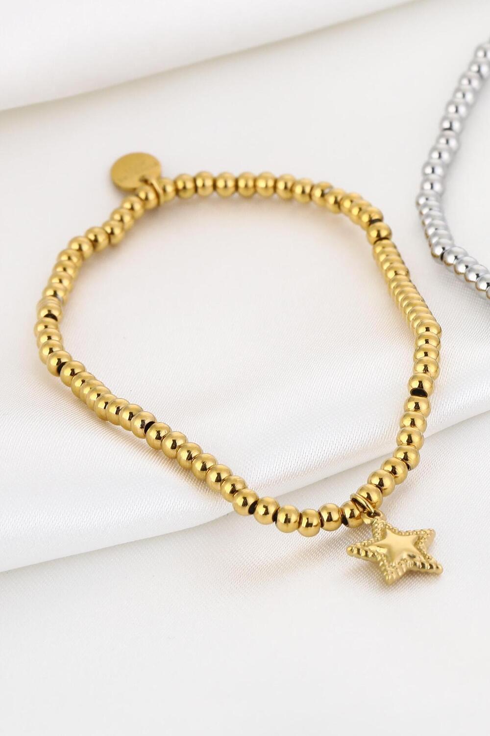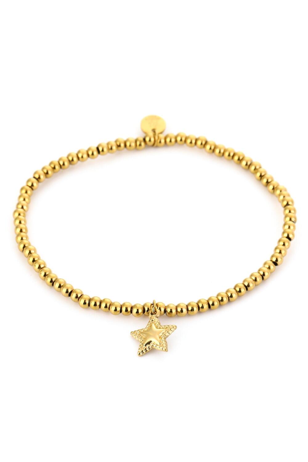 Gouden kralenarmband met ster, gemaakt van Stainless Steel. De totale lengte is 17,5 cm