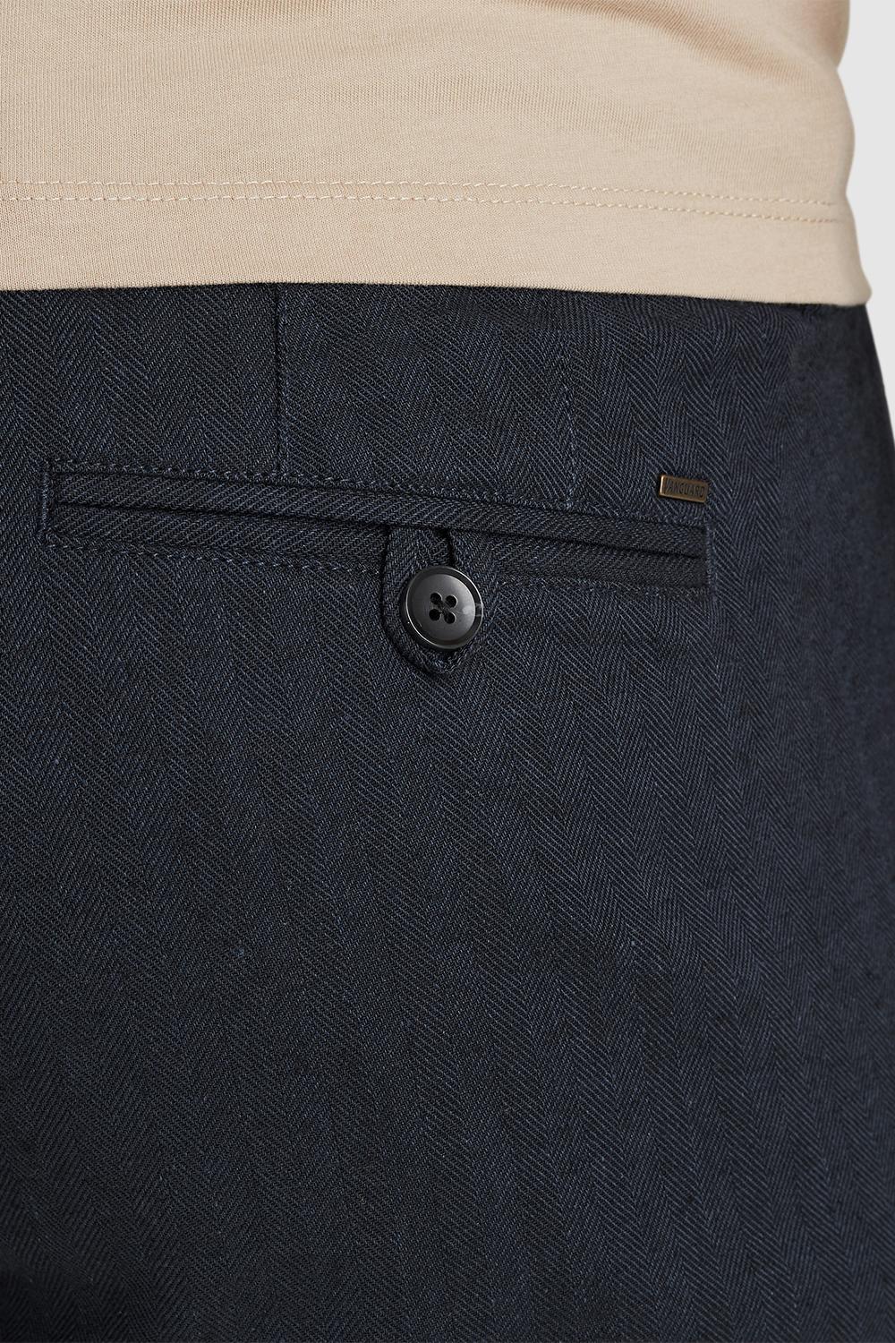 De Vanguard korte broek is een stijlvolle must-have voor de zomer. Deze slim fit broek is gemaakt van een hoogwaardige mix van 72% katoen, 26% linnen en 2% elastan. Hierdoor biedt hij jou niet alleen het comfort van natuurlijke materialen, maar ook een lichte stretch voor extra bewegingsvrijheid. Het visgraatpatroon geeft een subtiele textuur, waardoor deze broek zich onderscheidt van een standaard short. De regular waist en de vijf zakken zorgen voor een klassieke uitstraling, terwijl de knoop- en ritssluiting zorgen voor een perfecte pasvorm. Deze donkere korte broek van Vanguard is ideaal voor casual gelegenheden. Of je nu een dagje in het park doorbrengt of een informele bijeenkomst hebt; met deze broek zie je er altijd verzorgd uit. Combineer hem met een licht T-shirt en sneakers voor een ontspannen look die zowel comfortabel als modieus is. Het duurzame karakter van de stof maakt deze broek een betrouwbare keuze voor elk zomers avontuur.