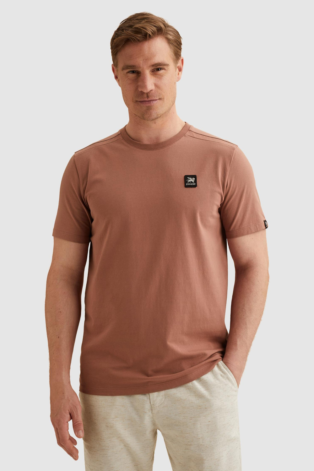 Dit casual T-shirt van Vanguard is een must-have voor je zomercollectie. Gemaakt van een hoogwaardige mix van 67% katoen, 28% gerecycled katoen, en 5% elastan, biedt het een aangename pasvorm en flexibiliteit. Met zijn ronde halslijn en regular fit past het perfect bij zowel jeans als shorts voor een ontspannen, maar stijlvolle look. Dit T-shirt heeft een subtiele merkbadge op de borst en de mouw, wat zorgt voor een eigentijds accent. Dankzij het duurzame materiaal is dit T-shirt een verstandige keuze voor de modebewuste man. Het normale model en de korte mouwen maken het ideaal voor warme zomerdagen, of je nu in de stad bent of op een vakantie aan het strand. De zachte roestkleur geeft een moderne twist aan jouw dagelijkse outfit. Of je nu een informele ontmoeting hebt of een weekendje weg gaat, met dit Vanguard T-shirt maak je altijd een goede indruk.