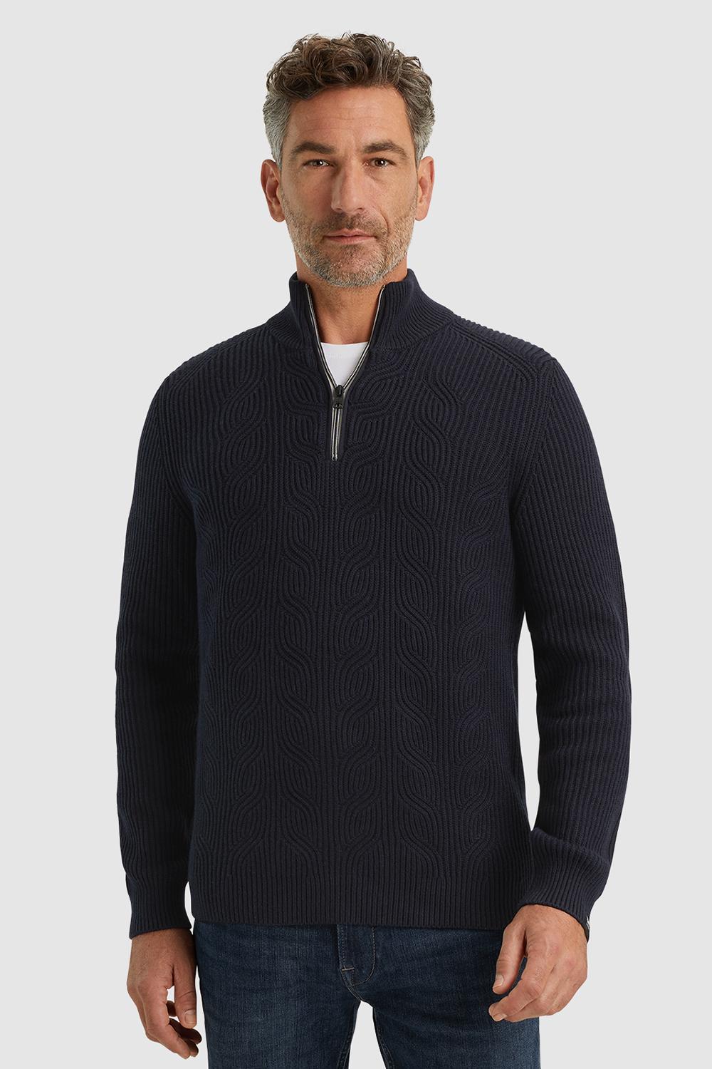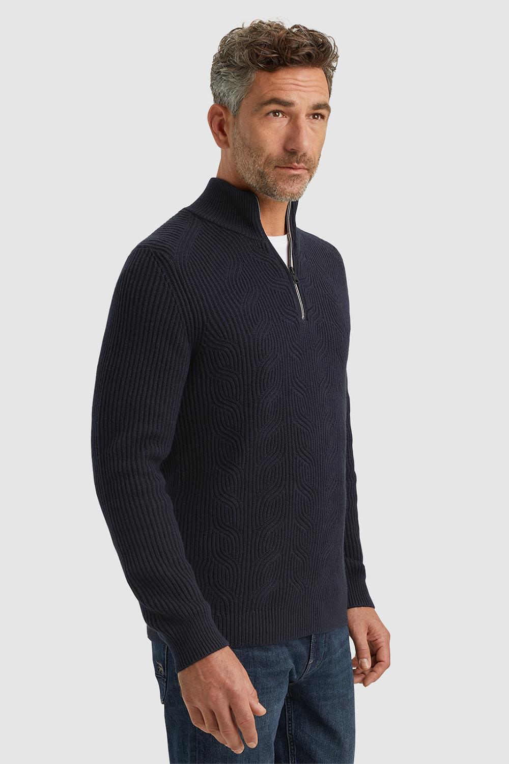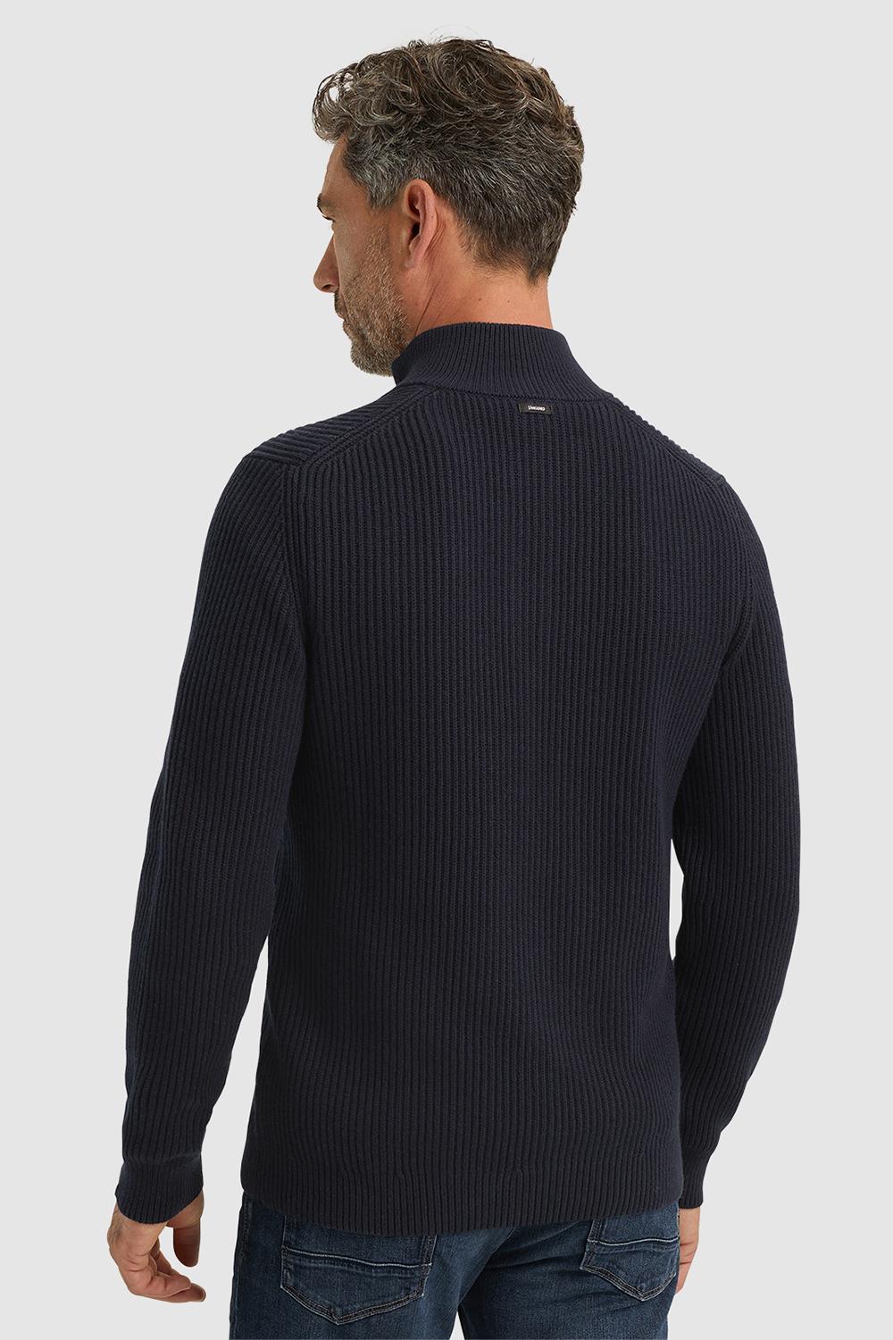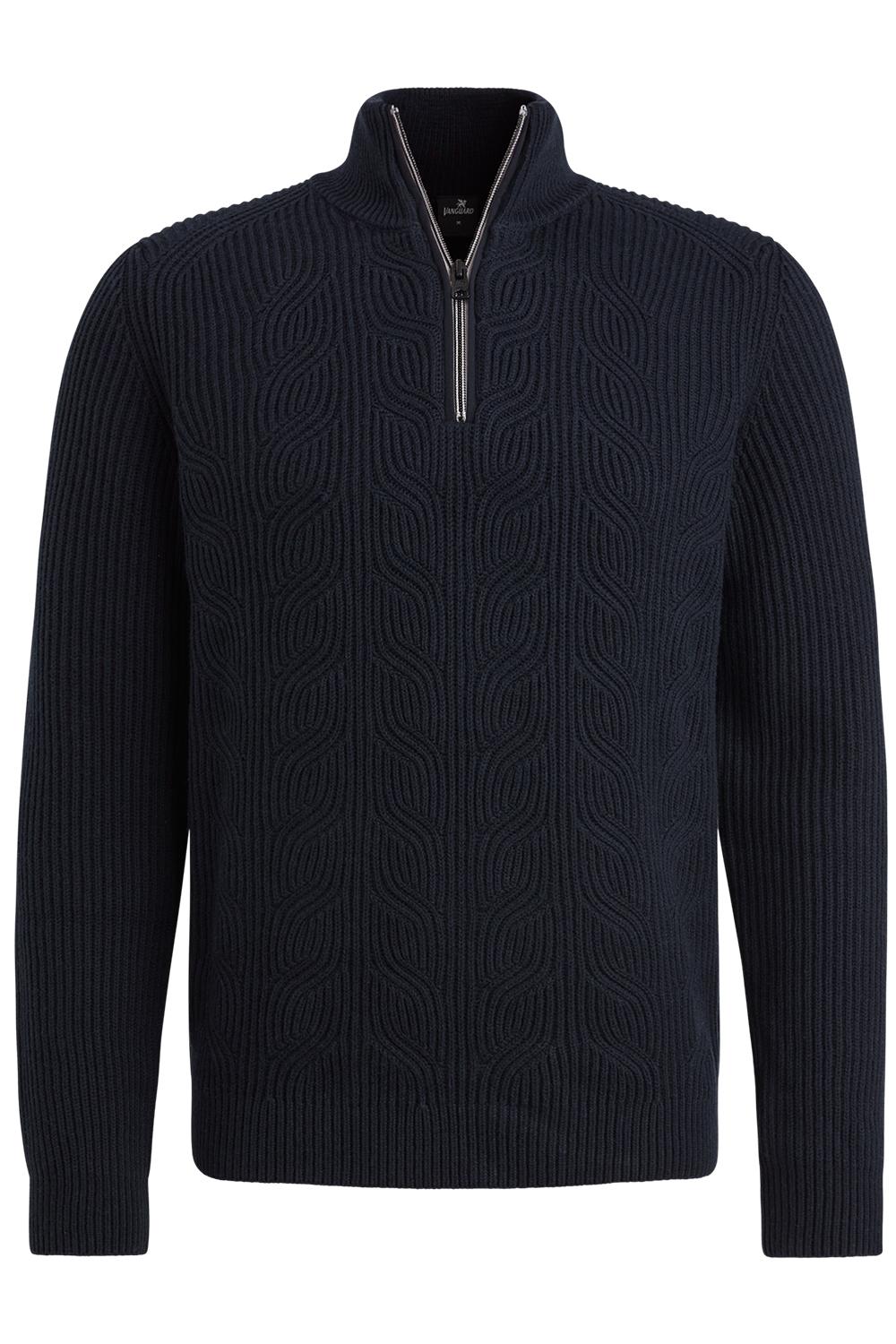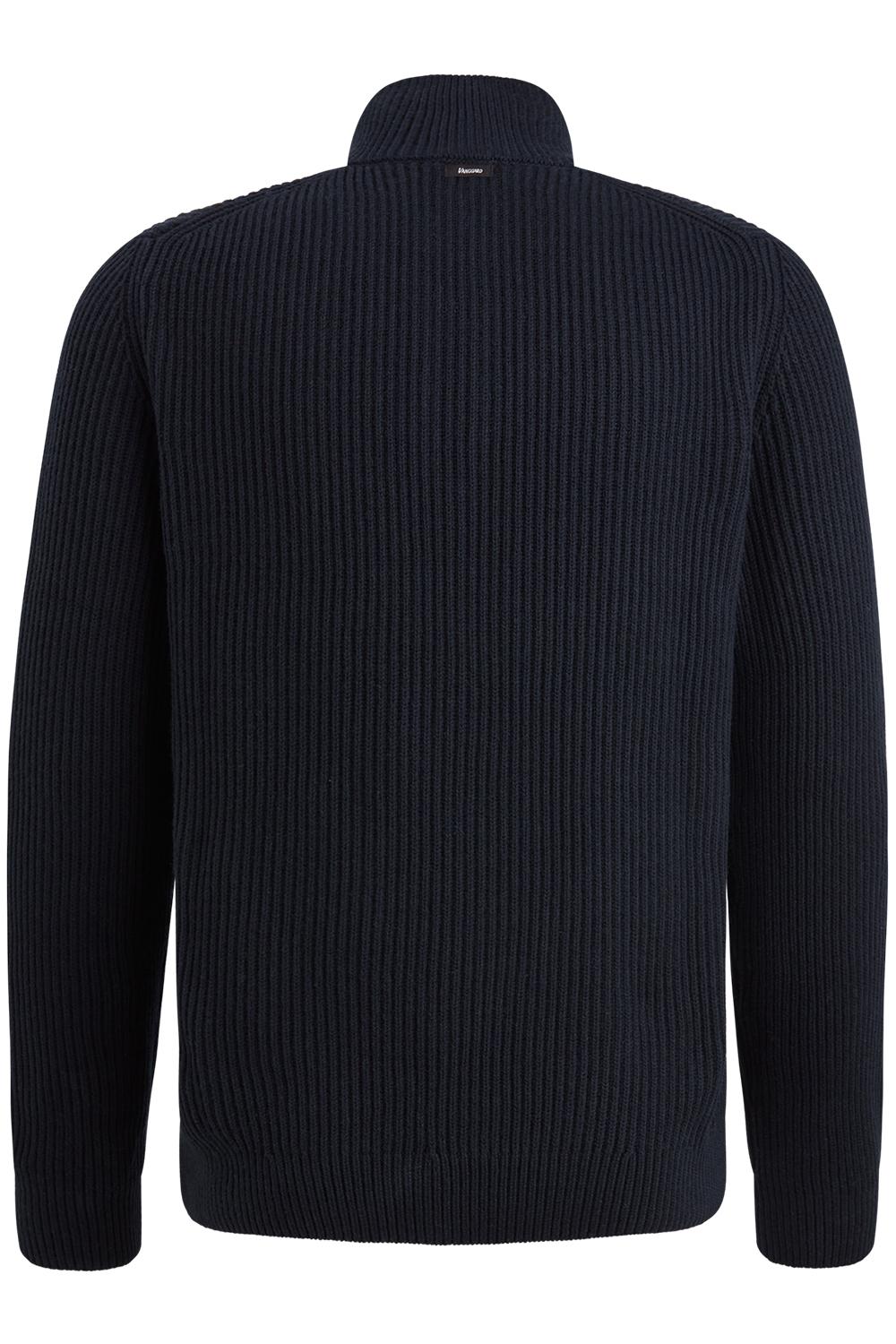 Gebreide trui van Vanguard. Dit model heeft lange mouwen en een hoge kraag met een halve rits. De trui is afgewerkt met een ribgebreide boord.