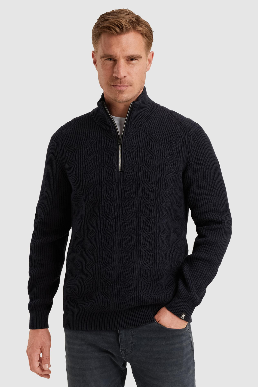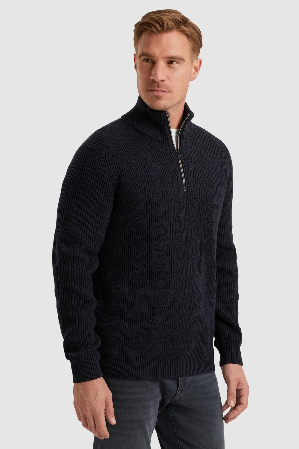 Deze stijlvolle navy trui van Vanguard is een veelzijdige keuze voor je wintergarderobe. Met een high neck en een praktische ritssluiting, biedt deze knitwear een reguliere pasvorm die comfortabel en warm is tijdens koude dagen. De trui is vervaardigd uit een duurzame mix van 60% katoen, 30% gerecycled polyamide en 10% wol, wat niet alleen bijdraagt aan een prettige draagervaring, maar ook aan een verantwoorde keuze. Dankzij het gestructureerde patroon heeft deze Vanguard trui een moderne uitstraling die zowel casual als net te dragen is. Ideaal voor een ontspannen weekend of een informele werkdag. Door de lange mouwen en de normale lengte is deze trui eenvoudig te combineren met een donkere jeans of chino voor een complete look. Of je nu naar buiten gaat voor een wandeling of een lunchafspraak hebt, deze trui biedt de perfecte balans tussen stijl en functionaliteit.