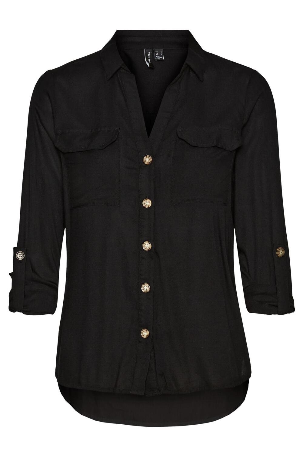 Deze stijlvolle zwarte damesblouse van Vero Moda is een veelzijdige keuze voor je garderobe. Gemaakt van 100% viscose, biedt het een zachte en comfortabele stof die ideaal is voor dagelijks gebruik. Met een regular fit pasvorm en een klassieke puntkraag, straalt de blouse een tijdloze elegantie uit. De gouden knoopsluiting voegt een vleugje verfijning toe, terwijl de borstzakken een praktisch detail zijn dat het geheel compleet maakt. De Vero Moda blouse is perfect voor verschillende gelegenheden. Combineer hem met een jeans voor een casual look tijdens een lunch met vrienden, of draag hem met een nette pantalon voor een meer formele setting. De lange mouwen passen zowel bij koelere dagen als bij een luchtige zomerdag wanneer je ze oprolt. Of je nu naar kantoor gaat of een dagje uit plant, deze blouse biedt je stijl en veelzijdigheid die makkelijk te combineren is.