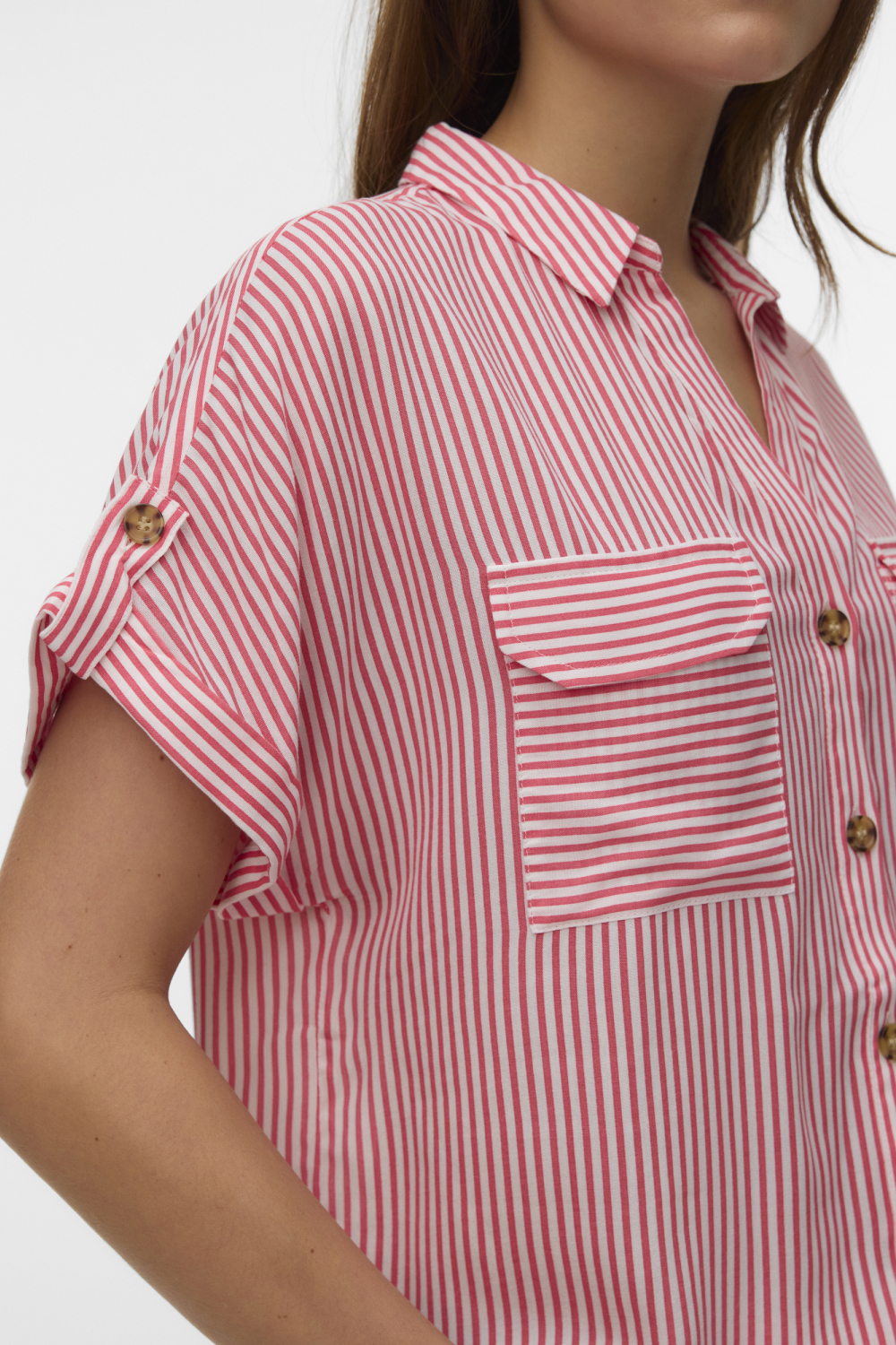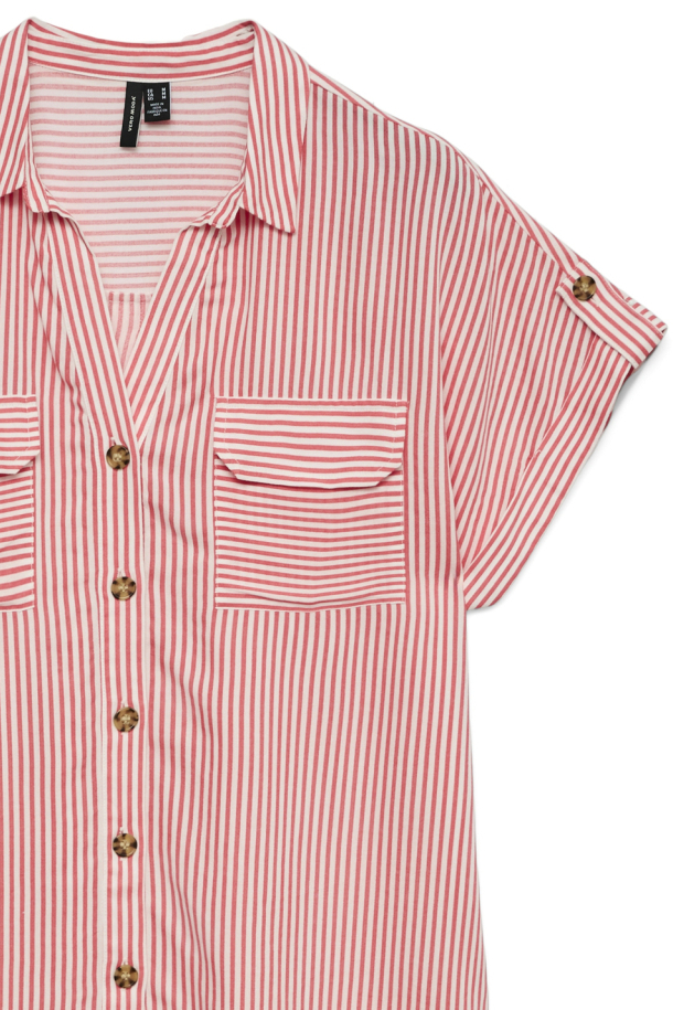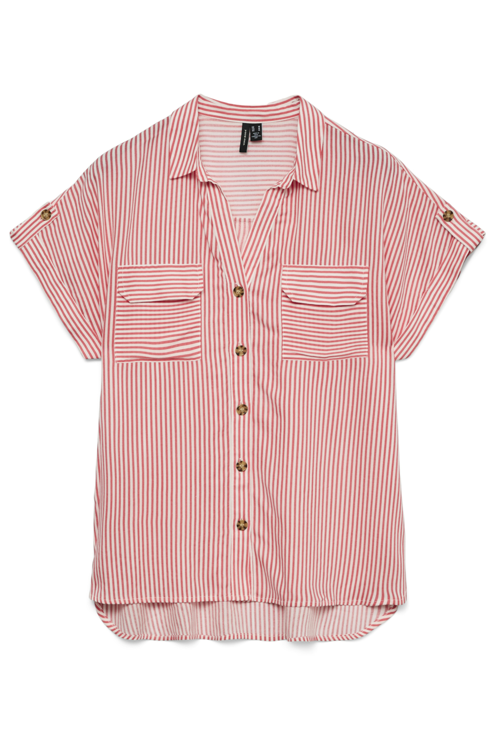 Deze casual streepjesblouse van Vero Moda is een veelzijdige keuze voor jouw lenteoutfits. Gemaakt van 100% Viscose Livaeco, biedt de stof een duurzame en milieuvriendelijke optie zonder concessies te doen aan comfort. De rode en witte strepen geven de blouse een speelse, frisse uitstraling, perfect voor een relaxte dag in het park of een informele bijeenkomst. De normale pasvorm en korte mouwen maken het dragen van deze blouse comfortabel en luchtig op warmere dagen, terwijl de knoopsluiting een klassiek detail toevoegt. Met twee praktische borstzakken is deze Vero Moda blouse niet alleen stijlvol, maar ook functioneel. De regular fit en normale lengte zorgen voor een comfortabele pasvorm die gemakkelijk te combineren is met jouw favoriete jeans of een zomerse rok. Of je nu een dagje gaat shoppen of een casual lunch date hebt, deze damesblouse past moeiteloos bij diverse gelegenheden. Voeg deze blouse toe aan je garderobe voor een vleugje eenvoudige stijl en een betrouwbare optie voor jouw dagelijkse looks.