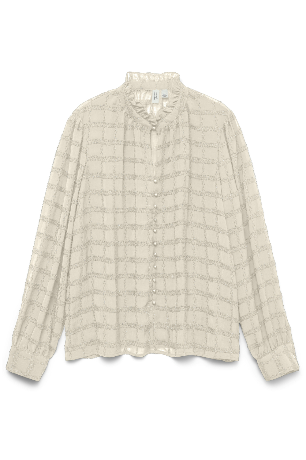 Deze elegante Vero Moda blouse in de kleur birch is een prachtige toevoeging aan jouw wintergarderobe. De blouse heeft een ronde hals en een lange mouw, wat zorgt voor een comfortabele en stijlvolle pasvorm. Het subtiele glitterpatroon geeft een vleugje glamour aan de blouse, ideaal voor zowel casual als meer formele gelegenheden. De knoopsluiting aan de voorkant voegt een klassieke touch toe, waardoor je de blouse gemakkelijk kunt combineren met zowel een nette broek als een casual jeans.