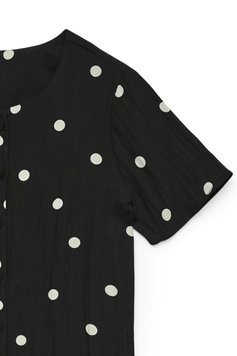 Deze casual stippenblouse van Vero Moda is een veelzijdige aanvulling op jouw voorjaarsgarderobe. Met de speelse stippenprint en de ronde hals creëer je eenvoudig een frisse en moderne look. Het materiaal, een lichte mix van 92% viscose en 8% polyester, zorgt voor een aangenaam draagcomfort, perfect voor warmere dagen. De knoopsluiting aan de voorkant voegt een subtiel detail toe, terwijl de korte mouwen het casual karakter van de blouse versterken.