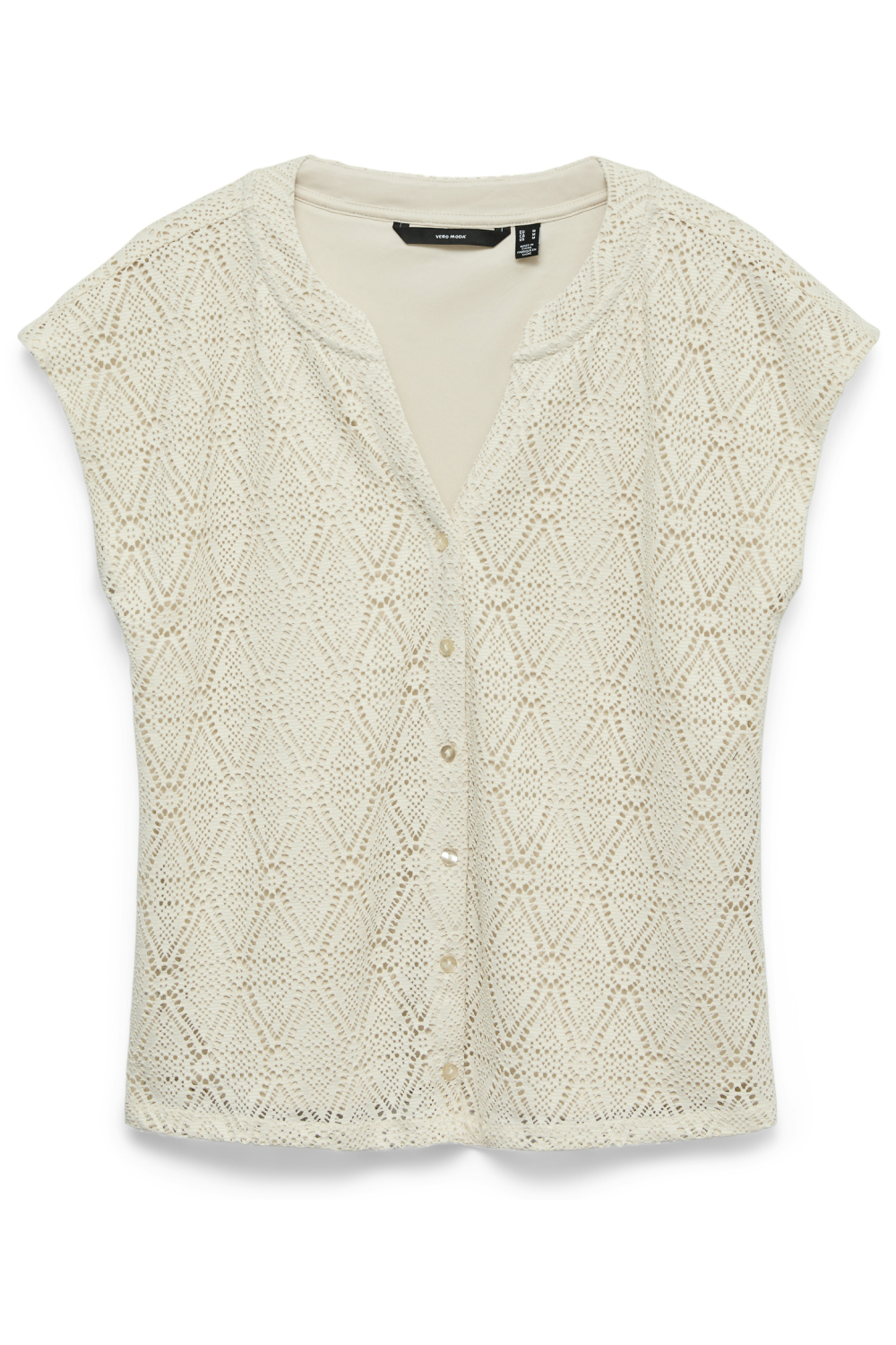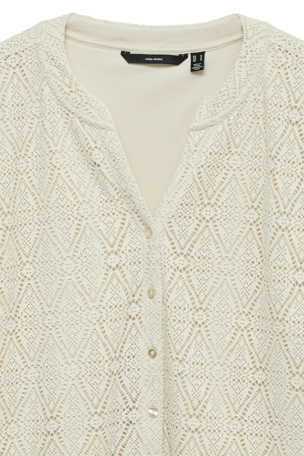 Deze elegante Vero Moda blouse is een tijdloze toevoeging aan je zomergarderobe. Uitgevoerd in de subtiele tint 'birch', biedt deze blouse een verfijnde uitstraling met een unieke ajour patroon. Het gebruik van 95% polyester en 5% elastan zorgt voor een luchtige en lichte stof die perfect aansluit bij de seizoenen. De regular fit geeft voldoende bewegingsruimte, terwijl de kapmouwen en de stijlvolle V-hals een vleugje verfijning toevoegen aan je look. Dankzij de subtiele knoopsluiting aan de voorkant is deze blouse ideaal voor casual gelegenheden, of je nu een dagje uitgaat of een gezellige middag met vrienden plant. Combineer hem met een lichte jeans of rok voor een frisse en moderne uitstraling. Of je nu op zoek bent naar een veelzijdig item voor je dagelijkse outfits, deze Vero Moda blouse biedt een stijlvolle en comfortabele optie die gemakkelijk te combineren is met verschillende kledingstijlen.