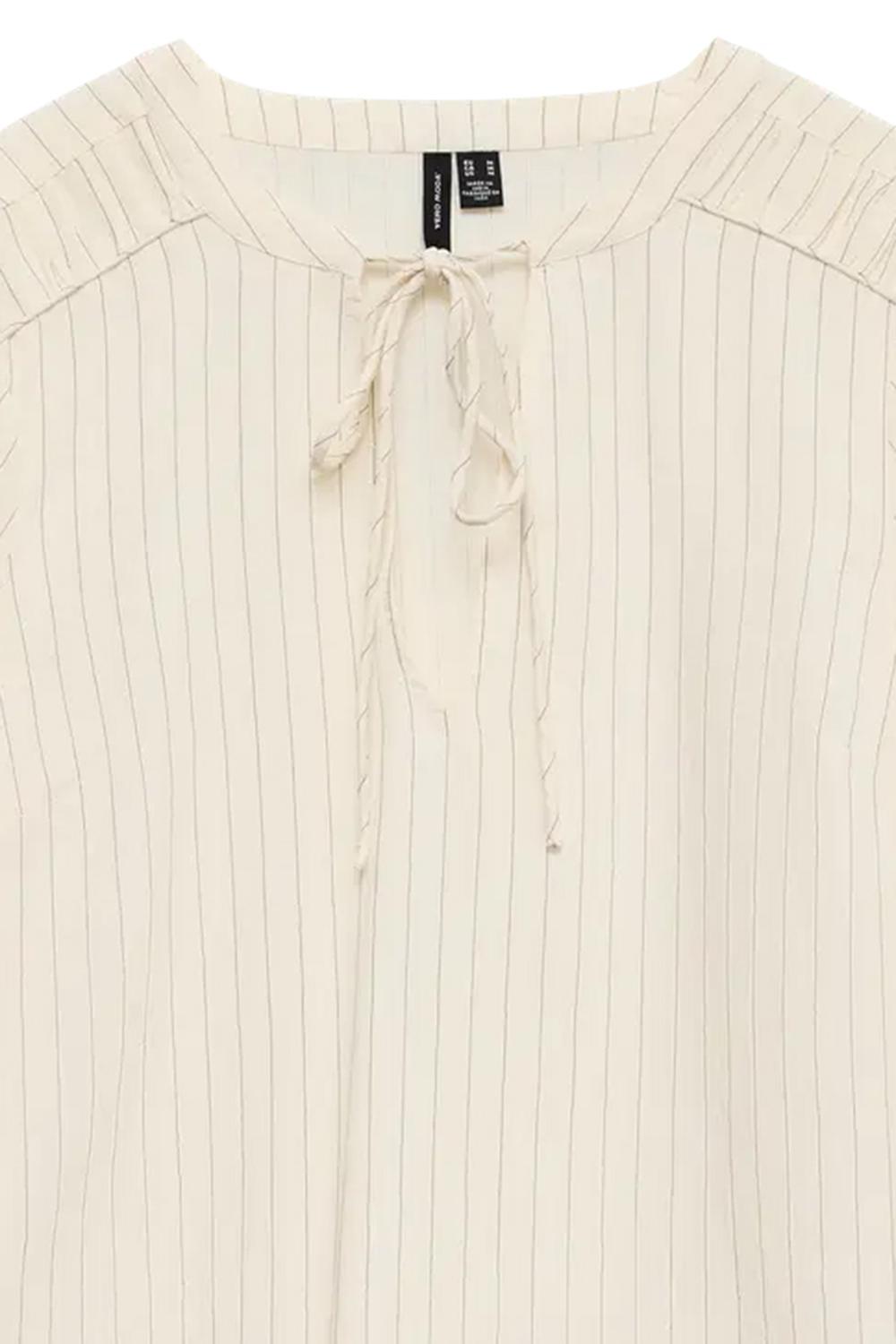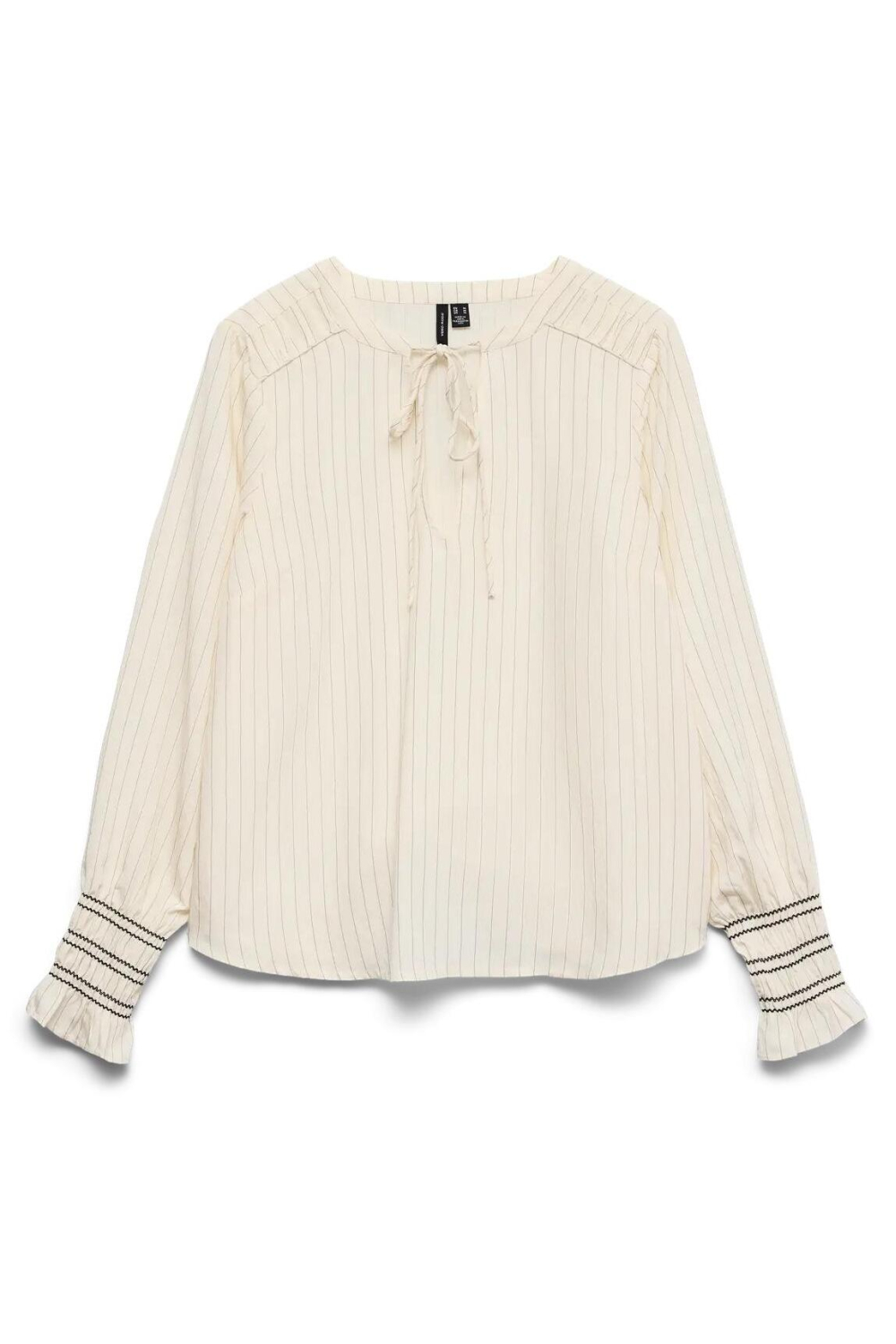Deze casual damesblouse van Vero Moda valt op door zijn elegante streeppatroon in de kleuren Birch en Black. Het is niet alleen stijlvol, maar ook comfortabel door de regular fit en de zachte stof, gemaakt van 80% Viscose Lenzing Ecovero en 20% Nylon. De blouse heeft een ronde hals en wordt geaccentueerd met een subtiel strikkoord, dat een speels detail toevoegt. De lange mouwen eindigen in een verfijnde afwerking met plooien, waardoor het een luchtige en elegante uitstraling krijgt, perfect voor lenteachtige dagen.