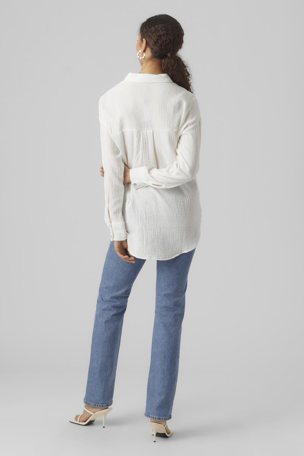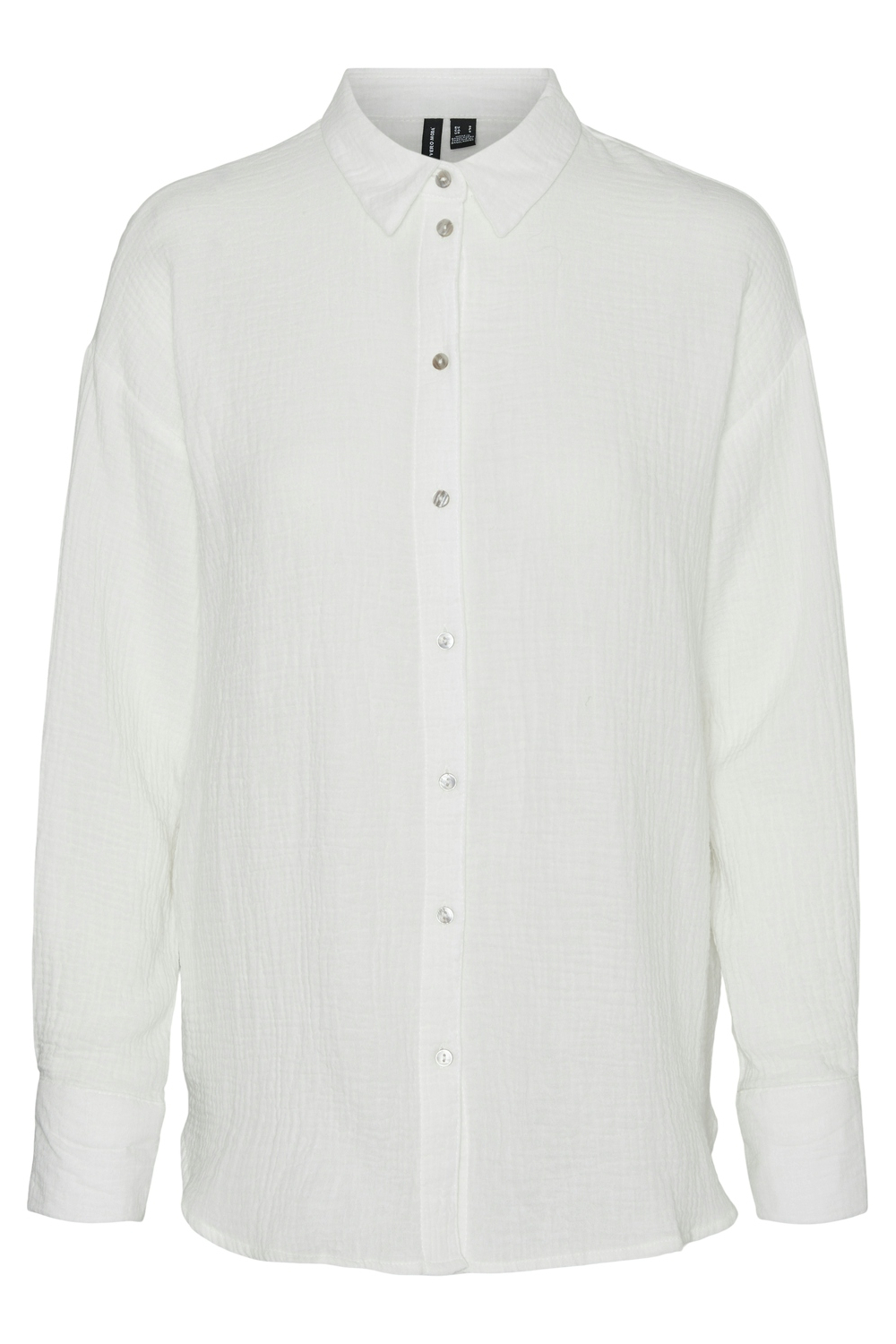 De casual blouse van Vero Moda, in een frisse snow white kleur, is een veelzijdig kledingstuk dat niet mag ontbreken in je garderobe. Deze damesblouse is gemaakt van 80% katoen en 20% gerecycled katoen, wat bijdraagt aan een duurzamer kledingstuk. Met een regular fit biedt deze blouse een comfortabele, losse pasvorm die perfect is voor de lente. De subtiele structuur in de stof geeft het een unieke uitstraling, terwijl de klassieke puntkraag en de knoopsluiting zorgen voor een tijdloos design.
