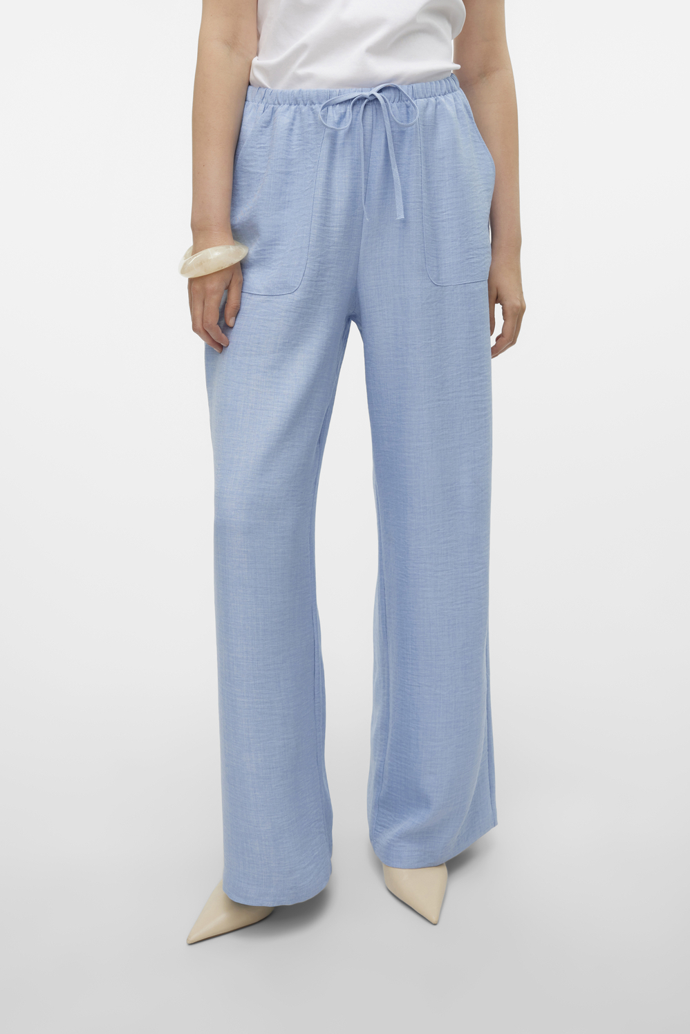 Deze elegante broeken van Vero Moda in Chambray blauw/melange zijn een veelzijdige keuze voor jouw casual garderobe. Het lichte polyester materiaal is comfortabel en valt soepel langs je benen dankzij de straight fit pasvorm. De elastische boord aan de taille biedt een ontspannen draagcomfort, terwijl de high waist zorgt voor een geklede uitstraling. Perfect voor zowel informele als meer geklede gelegenheden. Praktische steekzakken maken deze broek functioneel zonder in te boeten op stijl. De normale lengte is makkelijk te combineren met zowel sneakers als hakken, afhankelijk van de gelegenheid. Draag deze Vero Moda broek met een eenvoudig wit T-shirt voor een ontspannen dagje uit, of combineer met een blouse voor een meer formele look. Of je nu thuis werkt of een brunch met vrienden hebt, deze broeken zijn een stijlvolle en comfortabele keuze.