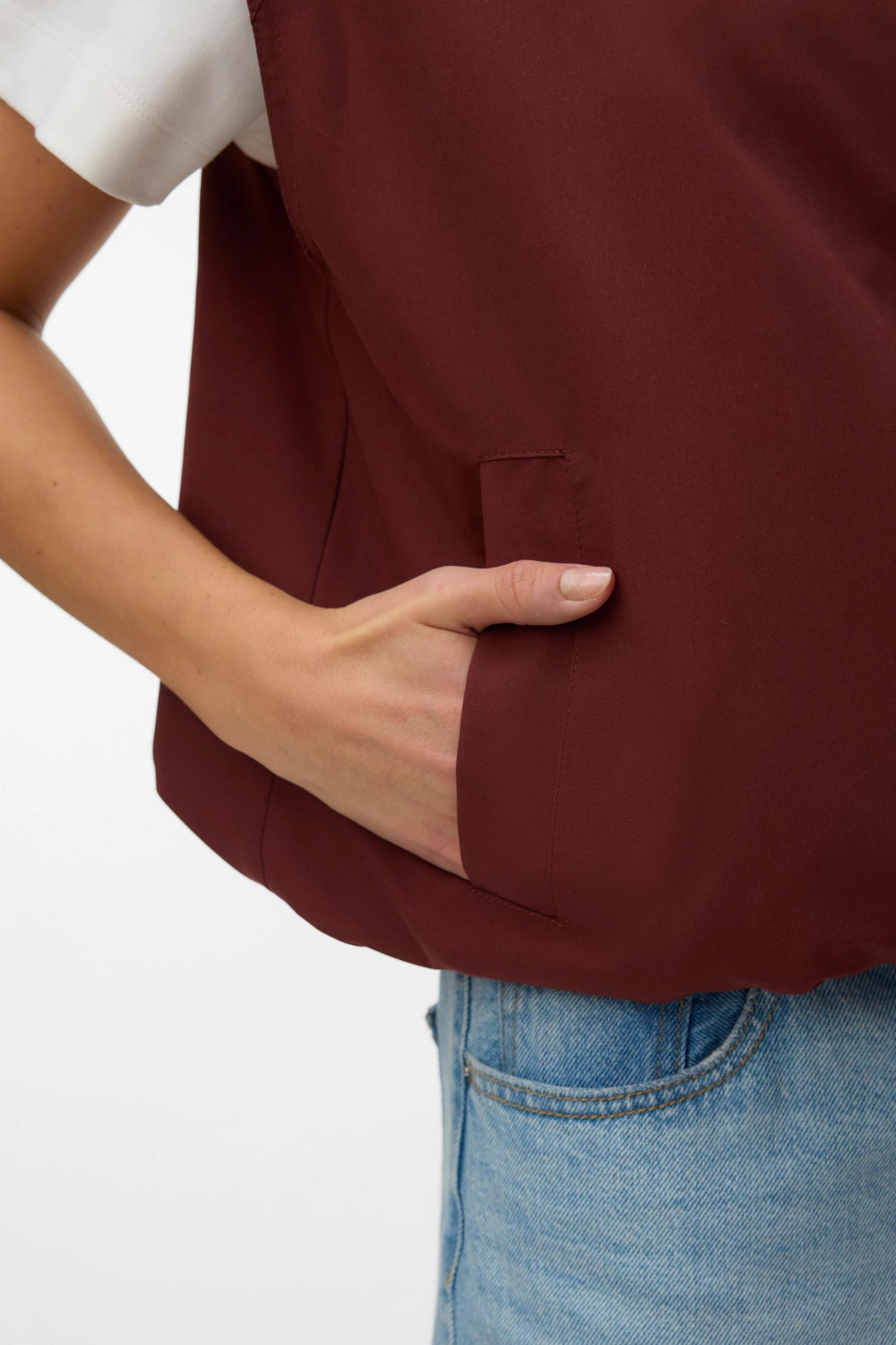 Dit elegante gilet van Vero Moda is een verfijnde toevoeging aan jouw casual garderobe. Het gilet is vervaardigd uit 100% gerecycled polyester en straalt daarmee niet alleen stijl uit, maar ook duurzaamheid. Met een high neck en een praktische rits aan de voorkant, biedt deze regular fit zowel comfort als een moderne uitstraling. De diepe wijnrode kleur zorgt voor een warme en veelzijdige look die zich moeiteloos laat combineren met verschillende outfits. Dankzij de handige steekzakken is dit mouwloze gilet niet alleen modieus, maar ook praktisch voor dagelijkse activiteiten in de lente. Perfect voor een informele lunch, een wandeling of een dagje in de stad. De normale lengte en het gebruik van lichte materialen maken het een geschikte keuze voor de veranderlijke lente dagen. Combineer het met een jeans en sneakers voor een ontspannen look, of draag het over een blouse voor een meer verfijnde stijl. Dit Vero Moda gilet is een veelzijdige keuze die bij elke gelegenheid past.