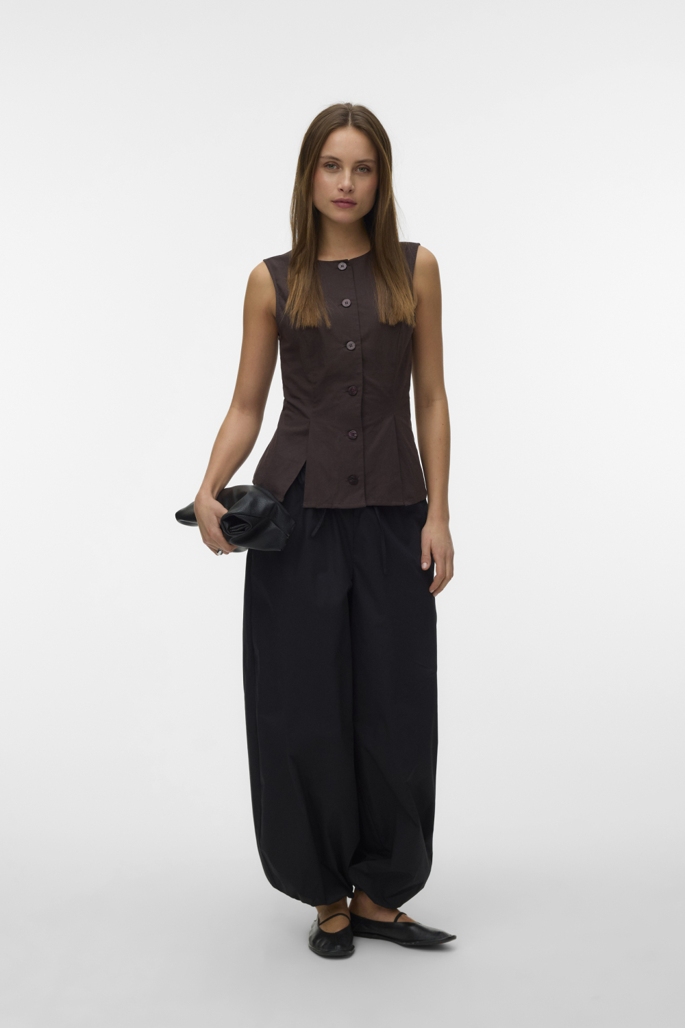 Dit stijlvolle Chocolate Torte gilet van Vero Moda is een ideale aanvulling op je lente-outfits. Gemaakt van een comfortabele mix van 85% katoen en 15% linnen, voelt het licht en luchtig aan. De regular fit en mouwloze snit maken het tot een veelzijdig stuk dat gemakkelijk over je favoriete tops en blouses gedragen kan worden. Met de ronde halslijn en vijf knopen aan de voorkant, straalt het een subtiele en casual elegantie uit. Het gilet is uitermate geschikt voor informele gelegenheden, zoals een ontspannen weekendbrunch of een dagje uit in de stad. Door de rijke Chocolade Torte kleur voegt het een warme tint toe aan je garderobe. Combineer het met een lichte jeans voor een relaxte look of draag het over een jurk voor een meer geklede stijl. Dit Vero Moda gilet biedt je de mogelijkheid om je outfit op een eenvoudige manier een stijlvolle twist te geven.