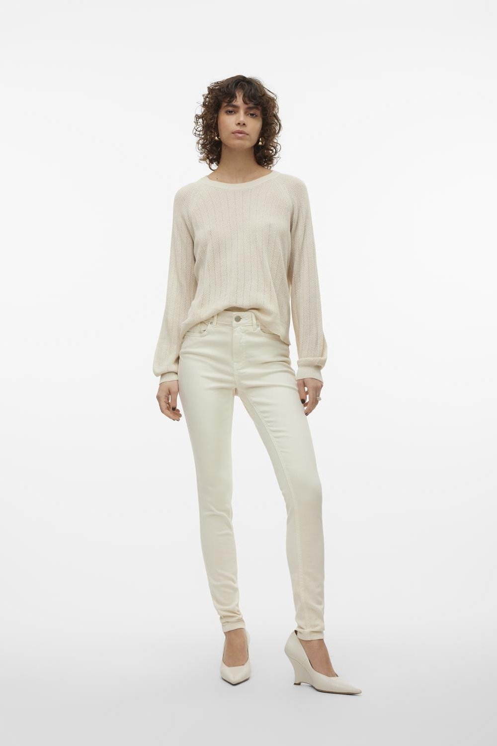 Deze elegante ecru jeans van Vero Moda biedt een stijlvolle toevoeging aan je garderobe. De skinny fit pasvorm sluit perfect aan en accentueert je vormen op een subtiele manier. Met een klassieke 5-pocket stijl heb je voldoende ruimte voor kleine essentials. De jeans zijn ontworpen met een knoop- en ritssluiting, wat bijdraagt aan een nette afwerking. Het ecru denim zorgt voor een zachte uitstraling, waardoor deze jeans een veelzijdige keuze is voor zowel casual als smart casual settings. Of je nu naar kantoor gaat of een avond uit op de agenda hebt, deze Vero Moda jeans past naadloos in elke situatie. De regular waist geeft comfort en ondersteuning, terwijl de normale lengte zorgt voor een tijdloze look. Combineer ze met een elegante blouse of een casual trui, afhankelijk van de gelegenheid. Dankzij de duurzame materialen is deze jeans niet alleen een modieuze, maar ook een verantwoorde keuze voor je basisgarderobe.