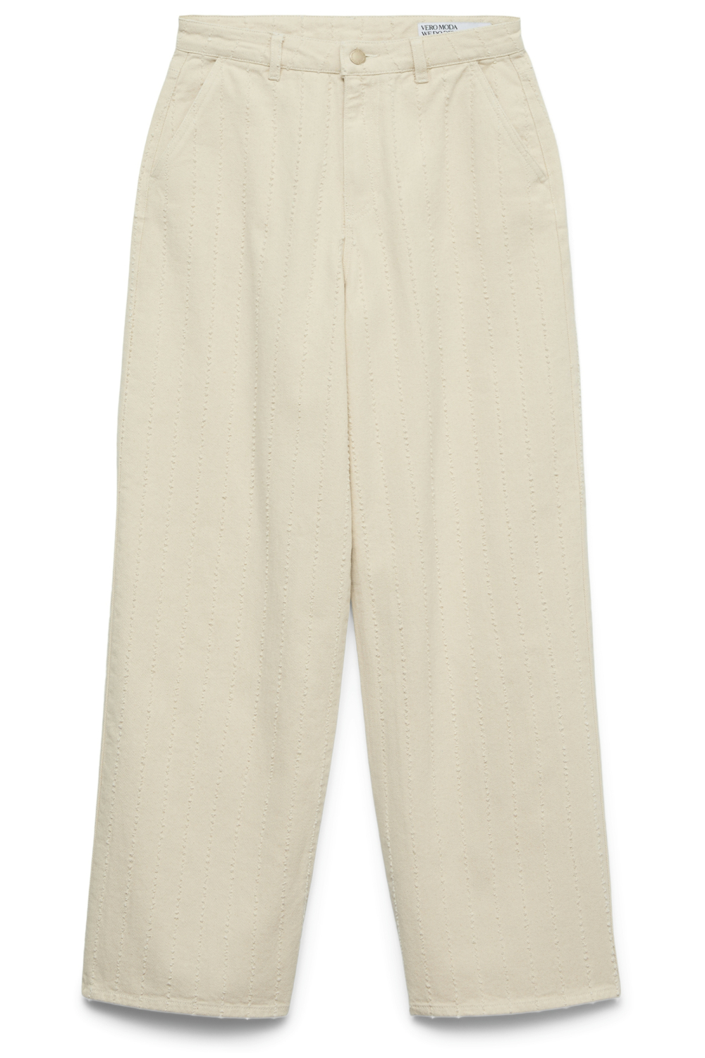 Deze casual ecru jeans van Vero Moda is een stijlvolle aanvulling op je lente garderobe. Gemaakt van 100% katoen, bieden ze een comfortabele en ademende stof die zorgt voor een aangenaam draagcomfort. Met een wide leg pasvorm straal je moeiteloos een relaxte stijl uit, terwijl de subtiele structuur van de stof een modern accent toevoegt. De reguliere taille en het gebruik van een knoop- en ritssluiting maken het ontwerp zowel praktisch als modieus voor alledaags gebruik. De Vero Moda jeans zijn voorzien van handige steekzakken, ideaal voor het opbergen van kleine benodigdheden. De neutrale ecru kleur maakt ze eenvoudig te combineren met verschillende tops, van casual t-shirts tot elegante blouses, en is daarmee geschikt voor diverse gelegenheden. Of je nu op weg bent naar een ontspannen lunch of een informele bijeenkomst, deze jeans passen perfect in jouw dagelijkse look. Voeg een paar stijlvolle sneakers of sandalen toe voor een complete, modieuze outfit.