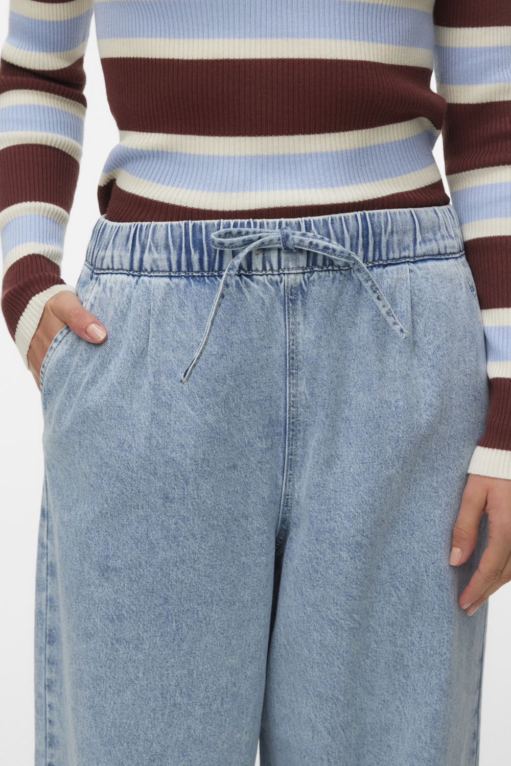 Deze Vero Moda wide leg jeans met een bleached wash is een perfecte keuze voor het lente seizoen. De broek heeft een elastische boord, waardoor je geniet van extra comfort en bewegingsvrijheid. De light blue denim kleur geeft deze denim een frisse uitstraling die moeiteloos te combineren is met zowel casual als meer geklede outfits. Dankzij de normale lengte is het een veelzijdig item dat goed past bij verschillende gelegenheden, van een relaxte dag in de stad tot informele bijeenkomsten. De jeans is stijlvol ontworpen met handige steekzakken aan de voorkant, wat zowel praktisch als modieus is. De regular waist zorgt voor een flatterende pasvorm die elk figuur complimenteert. Of je nu kiest voor een casual look met sneakers en een T-shirt, of voor een meer verfijnde stijl met hakken en een blouse, deze jeans is een fantastische basis voor talloze outfits. Een duurzame keuze die lang meegaat en makkelijk is in onderhoud.