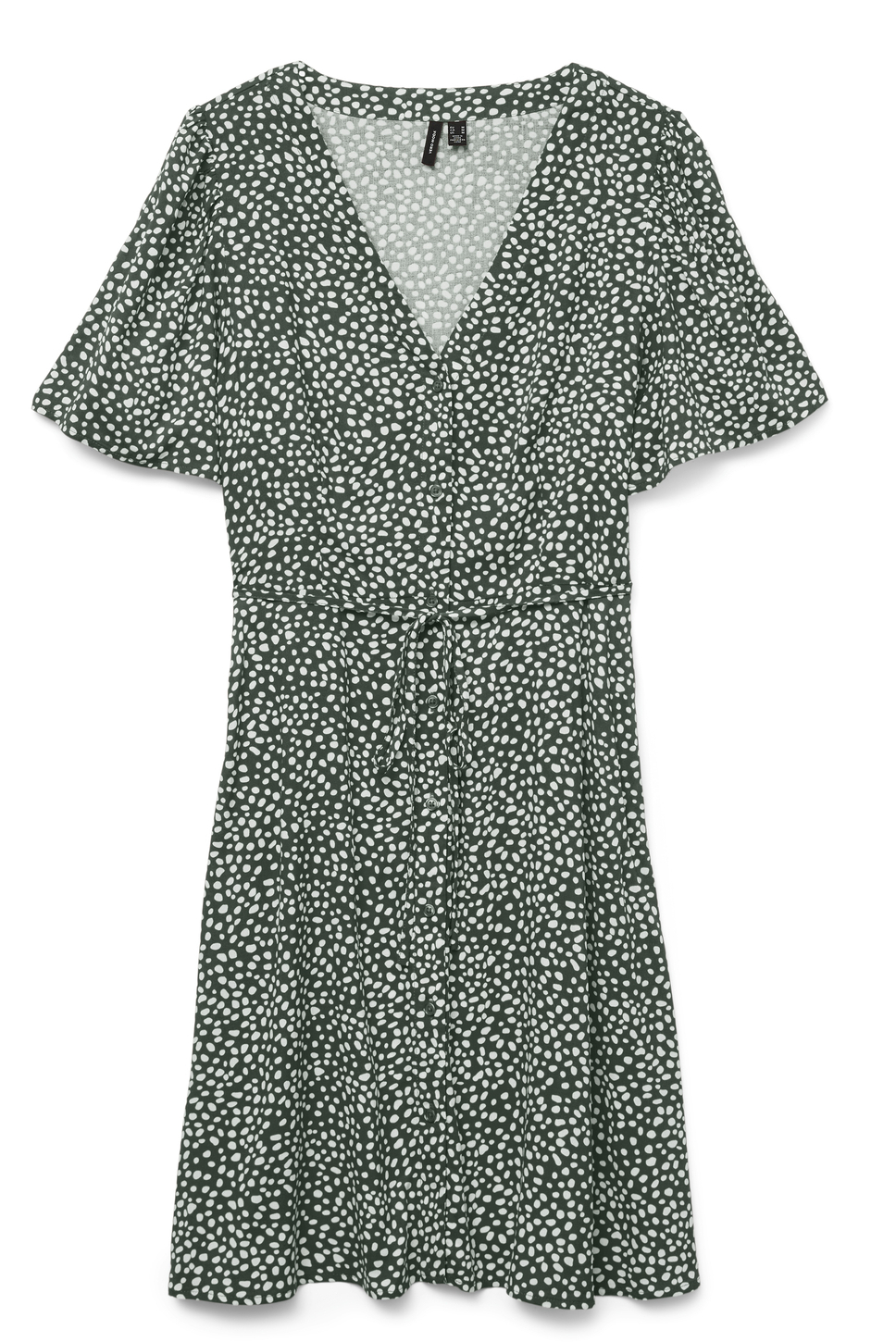 Deze charmante kortere jurk van Vero Moda valt op door de subtiele groene tint met een speels stippenpatroon. Gemaakt van 100% viscose, biedt de jurk een luchtige en comfortabele pasvorm die ideaal is voor dagelijkse casual outfits. De V-hals en het knoopdetail aan de voorkant zorgen voor een feestelijke en toch eenvoudige uitstraling. De korte mouwen maken deze jurk perfect voor warme dagen en geven het een zorgeloos karakter, waardoor je je vrij en comfortabel kunt bewegen. Of je nu een informele lunch hebt of een dagje uit met vrienden, deze Vero Moda jurk past zich moeiteloos aan verschillende gelegenheden aan. Het tijdloze ontwerp en de regular fit maken het makkelijk om te combineren met je favoriete sneakers of een paar elegante sandalen voor een veelzijdige look. Dankzij het strikceintuur in de taille kun je de pasvorm naar wens aanpassen, wat zorgt voor een flatterend silhouet. Voeg dit stijlvolle item toe aan je garderobe en geniet van een zorgeloze stijl die moeiteloos te matchen is. Meer informatie: Totale lengte is 84 cm bij maat S.