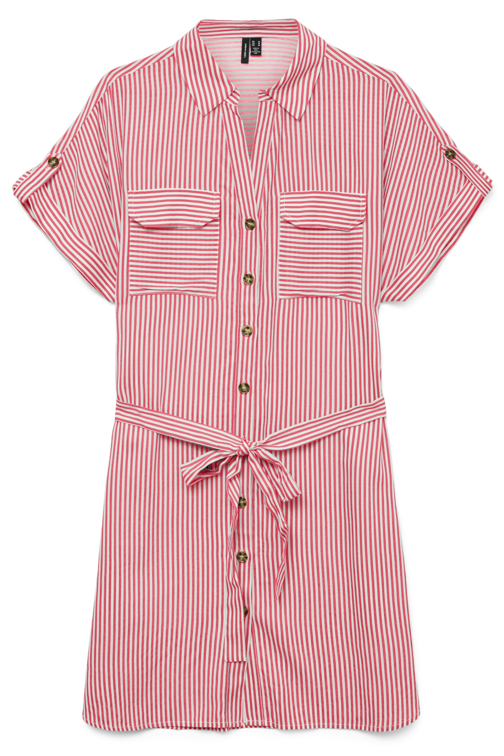 Met deze casual gestreepte jurk van Vero Moda maak je altijd een stijlvolle indruk. Gemaakt van 100% Viscose Livaeco van Birla Cellulose, biedt deze jurk zowel duurzaamheid als comfort. De puntkraag en knoopsluiting zorgen voor een klassieke touch, terwijl de korte mouwen en borstzakken een speelse uitstraling geven. De rood-witte strepen en de bijpassende strik tailleband zorgen voor een frisse, moderne look die perfect is voor de lente. Deze korte Vero Moda jurk is ideaal voor informele gelegenheden. Of je nu een wandeling in het park maakt of een casual lunch met vrienden hebt, deze jurk past perfect bij diverse zomerse settings. Combineer hem met sandalen voor een relaxte uitstraling, of kies voor sneakers voor een sportieve twist. De regular pasvorm zorgt ervoor dat je je altijd comfortabel voelt, terwijl de ademende stof je koel houdt op warme dagen.