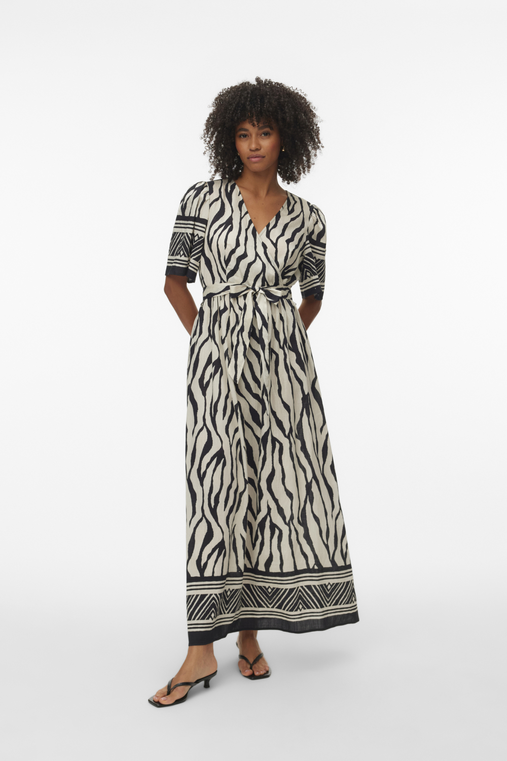 Deze lange zomerjurk van Vero Moda is een elegante toevoeging aan elke garderobe. Het opvallende animal patroon in zwart-wit zorgt voor een speelse, maar stijlvolle uitstraling die perfect past bij zomerse gelegenheden. Het ontwerp heeft een overslaghals en een strikkoord in de taille, wat zorgt voor een flatterende pasvorm. Gemaakt van 88% viscose en 12% polyamide, biedt de jurk een comfortabele en luchtige textuur, ideaal voor warme dagen. Met zijn casual stijl en korte mouwen is deze jurk een veelzijdige keuze voor verschillende momenten. Of je nu een dagje uit gaat of een informele bijeenkomst bijwoont, deze Vero Moda jurk zorgt voor een moeiteloze look. Combineer met je favoriete sandalen of slippers voor een complete zomerse outfit. Dankzij de klassieke patronen en de regular fit, biedt deze jurk zowel comfort als stijl, waardoor jij je de hele dag zelfverzekerd voelt.