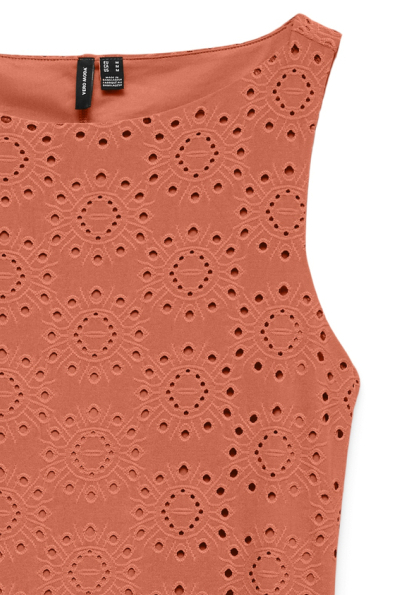 Deze elegante en casual jurk van Vero Moda is een veelzijdige toevoeging aan je zomergarderobe. De jurk is vervaardigd uit 95% gerecycled polyester en 5% elastaan, wat zorgt voor een comfortabele, lichte en duurzaam verantwoorde stof. Met een speelse ajourpatroon en een stijlvolle, roestkleurige uitstraling is deze jurk perfect voor warme zomerdagen. De boothals en de mouwloze afwerking geven het een verfijnde en luchtige look. De regular fit van deze Vero Moda jurk maakt hem geschikt voor allerlei gelegenheden, of je nu een ontspannen dag hebt gepland of een sociale bijeenkomst bijwoont. Met zijn korte lengte straalt de jurk zomerse flair uit, terwijl de hoogwaardige voering van polyester extra draagcomfort biedt. Combineer deze jurk met je favoriete sandalen voor een casual look of kies voor elegante accessoires om een meer verfijnde uitstraling te creëren. Meer informatie: De totale lengte is 89 cm bij maat S.