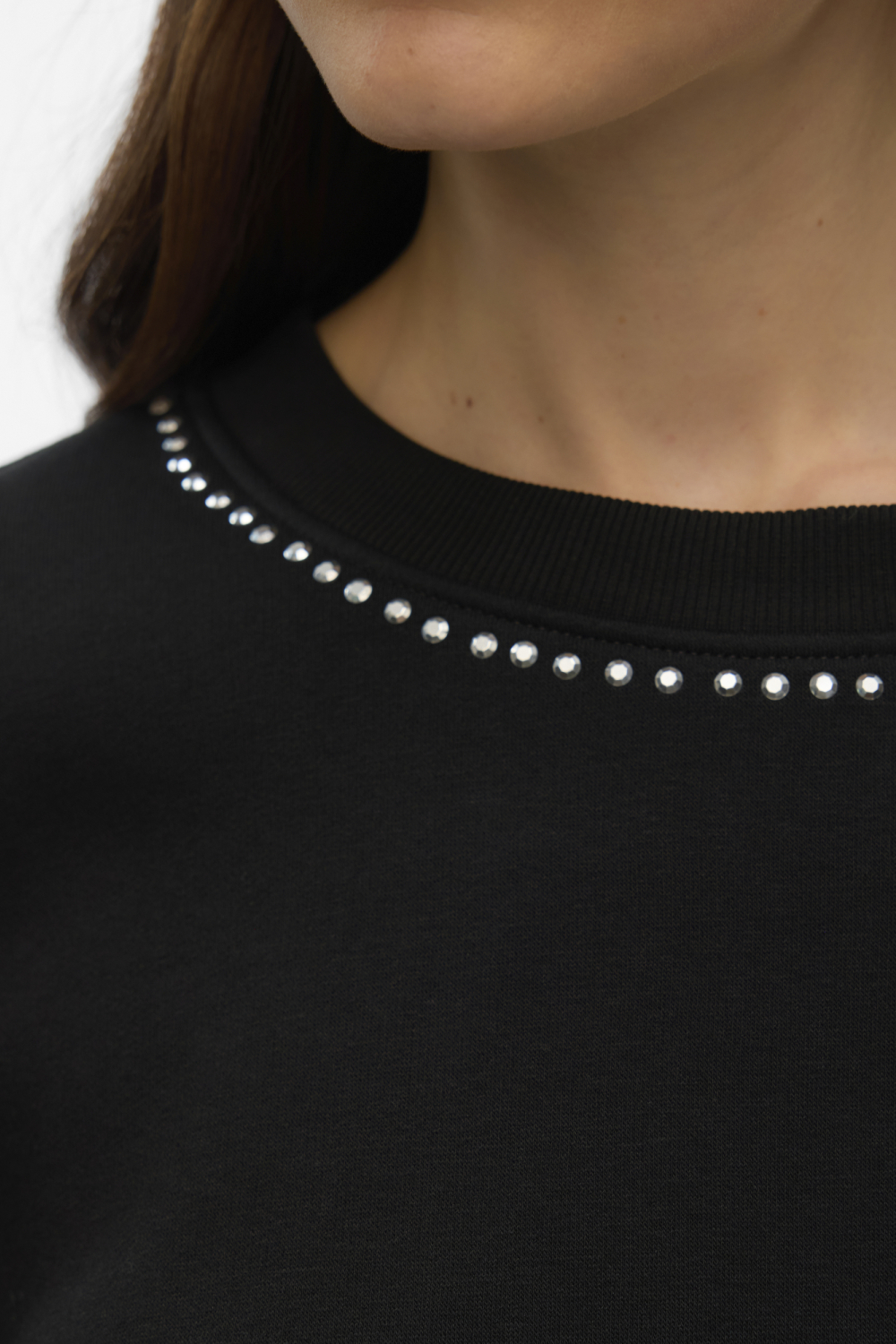 De zwarte kleur maakt deze sweater veelzijdig en makkelijk te combineren met verschillende outfits. Of je nu kiest voor een casual look met jeans of besluit het wat chiquer te dragen met een rok, deze Vero Moda sweater past bij elke stijl. De normale lengte zorgt ervoor dat de sweater altijd goed valt en de strassdetails geven een moderne en modieuze twist. Een must-have voor wie op zoek is naar een comfortabele en stijlvolle toevoeging aan de wintergarderobe.