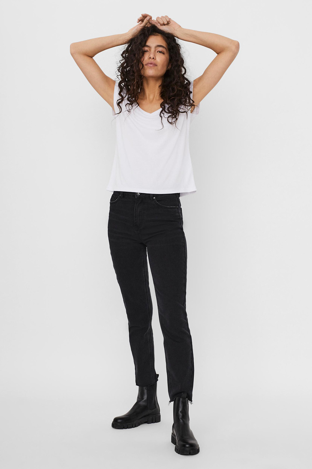 Dankzij het tijdloze design en de normale lengte kun je dit T-shirt eenvoudig combineren met je favoriete jeans of een comfortabele broek voor een moeiteloze look. Het is een uitstekende keuze voor alledaagse situaties, of je nu informeel afspreekt met vrienden of een casual dag op kantoor hebt. De duurzame materialen zorgen ervoor dat het shirt zijn frisheid behoudt, was na was. Voeg dit veelzijdige item van Vero Moda toe aan je basiscollectie en geniet van de eenvoud en stijl die het met zich meebrengt.