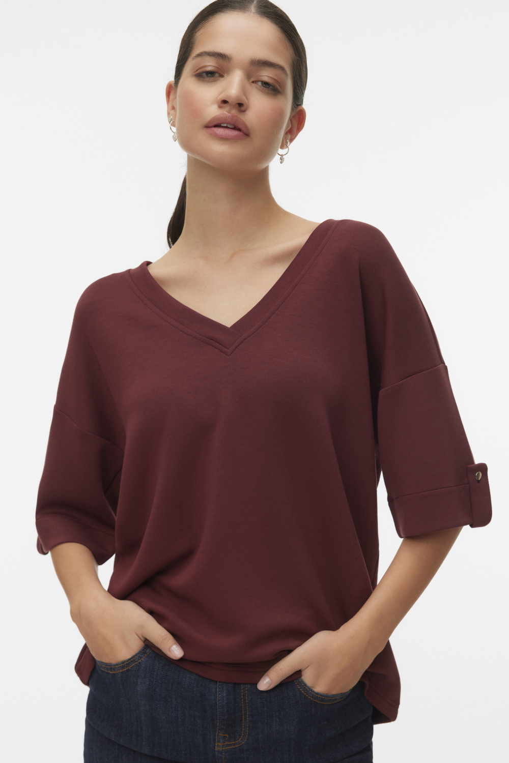 Dit casual T-shirt van Vero Moda is een stijlvolle toevoeging aan je lente garderobe. Het ontwerp combineert comfort met een eigentijdse uitstraling, dankzij de regular fit pasvorm en de diepe V-hals. De rijke bordeauxrode kleur geeft dit T-shirt een verfijnde touch, terwijl de knoopdetails op de korte mouwen een speels accent toevoegen. Gemaakt van zacht, ademend materiaal, is dit T-shirt perfect voor dagelijks gebruik. Of je het nu combineert met een jeans voor een ontspannen dagje uit of met een rok voor een iets formelere gelegenheid, met dit Vero Moda T-shirt sla je altijd de juiste toon aan. Dankzij de normale lengte en de duurzame kenmerken is het T-shirt niet alleen modieus maar ook verantwoord. Een veelzijdig item dat in elke damesgarderobe thuis hoort, perfect voor een casual look die stijl en gemak uitstraalt.