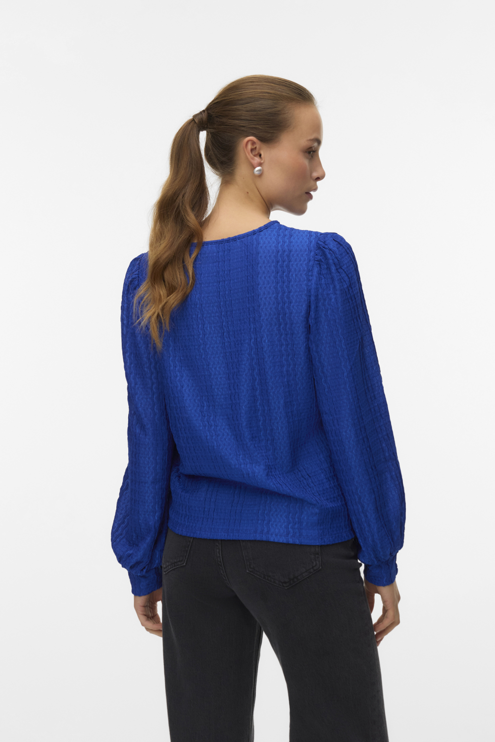 De lange mouwen maken het een geschikte keuze voor de frisse dagen, terwijl de normale lengte ervoor zorgt dat het makkelijk te combineren is met verschillende broeken of rokjes. Of je nu gaat voor een dagje uit met vrienden of een ontspannen middag thuis, dit T-shirt is een veelzijdige optie. Met zijn blauwe tint en unieke textuurpatroon maak je een gedurfde, maar toch subtiele modekeuze.