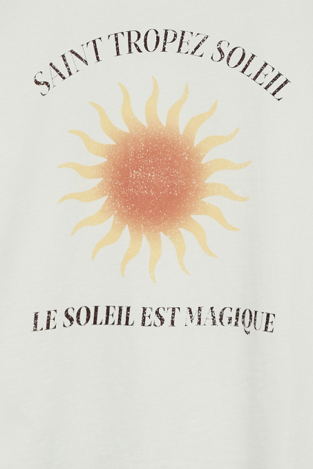 Dit casual dames T-shirt van Vero Moda is een veelzijdige keuze voor je lentegarderobe. Gemaakt van 100% biologisch katoen, biedt het een zachte en duurzame stof die ideaal is voor dagelijks gebruik. Het shirt heeft een regular pasvorm en een ronde hals, waardoor het comfortabel draagt. De fabrikant kleur "snow white" zorgt voor een frisse uitstraling, compleet met een opvallende grafische print van een zon en de tekst "Saint Tropez Soleil" en "Le Soleil Est Magique" op de voorkant. Dankzij de korte mouwen en normale lengte is dit T-shirt perfect voor casual dagen in de lente. Combineer het met een paar jeans of een lichte rok voor een moeiteloze en stijlvolle outfit. De grafische elementen geven een speelse twist aan je look, ideaal voor een ontspannen dagje buiten of een informele bijeenkomst met vrienden. Dit Vero Moda T-shirt is een uitstekende keuze voor iedereen die houdt van comfortabele en modieuze kledingstukken.