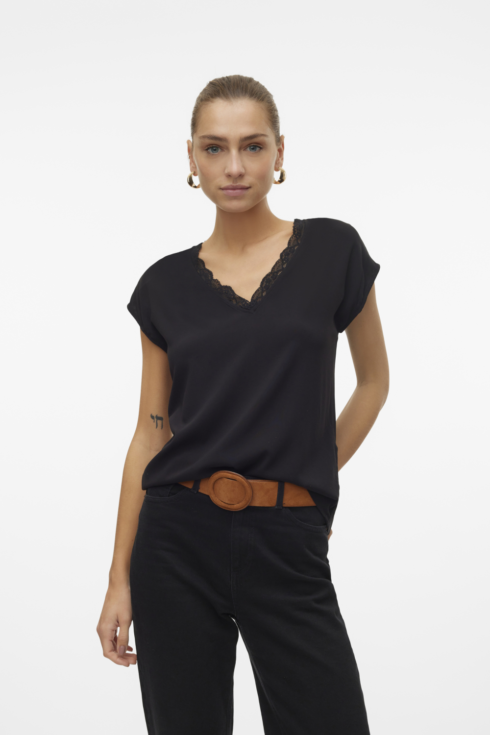 Deze verfijnde zwarte top van Vero Moda is een stijlvolle keuze voor elke gelegenheid dit lente seizoen. De top heeft een regular fit en een elegante V-hals afgewerkt met prachtig kant, wat een subtiele en vrouwelijke uitstraling geeft. De kapmouwtjes voegen een speels element toe terwijl de normale lengte ervoor zorgt dat het kledingstuk overal goed mee te combineren is. Gemaakt van een zachte mix van 97% viscose en 3% elastan, biedt deze top een comfortabele pasvorm die aangenaam aanvoelt op de huid. Dankzij het tijdloze ontwerp is deze Vero Moda top een perfect stuk om zowel casual als semi-formele looks mee te creëren. Draag de top met een nette zwarte broek voor een avondje uit, of combineer hem met een jeans voor een relaxte dag met vrienden. De zwarte kleur zorgt ervoor dat je met accessoires kunt spelen, zoals opvallende sieraden of kleurrijke sjaals. Met zijn veelzijdige stijl is deze top een waardevolle aanvulling voor elke kledingkast.