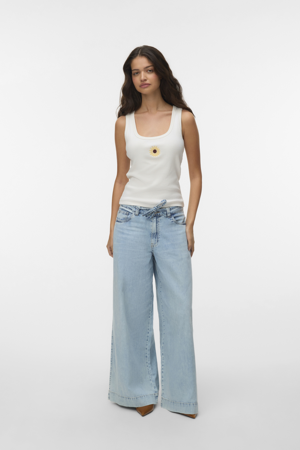 Deze stijlvolle dames top van Vero Moda is een veelzijdige aanvulling op je wintergarderobe. Gemaakt van een comfortabele mix van 95% katoen en 5% elastaan, biedt het een zachte en aansluitende slim fit pasvorm die je silhouet mooi accentueert. De top heeft een elegante ronde hals en mouwloos ontwerp, waardoor het een perfecte keuze is voor zowel casual als feestelijke gelegenheden. Op de voorkant prikt een subtiele zonnebloem, wat een charmante en speelse touch toevoegt. Met zijn tijdloze witte kleur en normale lengte kun je deze Vero Moda top gemakkelijk combineren met verschillende stijlen. Of je nu een gezellige avond thuis plant of een informele bijeenkomst bijwoont, deze top past perfect bij een jeans of rok voor een moeiteloze, stijlvolle look. De eenvoudige maar verfijnde look maakt het een veelzijdig kledingstuk dat in vrijwel elke situatie gedragen kan worden.