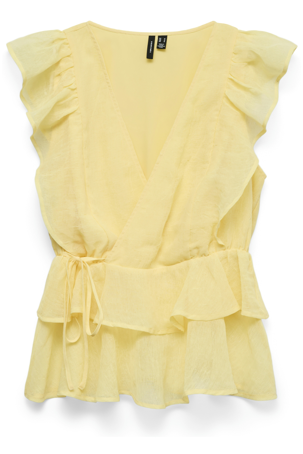 Dit luchtige Pale Banana topje van Vero Moda is een verfijnde aanvulling op je zomergarderobe. Gemaakt van 100% gerecycled polyester, biedt deze mouwloze top een milieuvriendelijke keuze zonder concessies te doen aan stijl. De overslaghals en het strikkoord zorgen voor een elegante uitstraling, wat het perfect maakt voor zowel informele als iets meer geklede zomerse uitstapjes. Dankzij de vrouwelijke ruches aan de schouders en de taille creëer je een speelse en flatterende look. De normale lengte zorgt ervoor dat de top eenvoudig te combineren is met een rok of broek naar keuze. Of je nu een casual dag op het terras doorbrengt of een zomerse avondwandeling maakt, deze Vero Moda top geeft je die comfortabele, maar stijlvolle look die je zoekt.