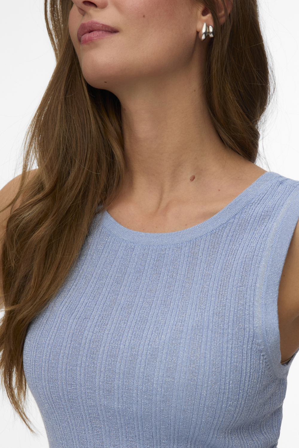 Deze stijlvolle top van Vero Moda is een ideale toevoeging aan jouw lentegarderobe. Het mouwloze design met slim fit pasvorm en ronde hals geeft je een elegante uitstraling. Gemaakt van duurzame 76% Viscose Lenzing Ecovero en 24% Metaalgaren, biedt deze top een subtiele glans die te zien is dankzij het glitterpatroon. De zachte, lichtblauwe kleur maakt het gemakkelijk om te combineren met zowel casual als formele stukken in je kledingkast. De Vero Moda top voelt comfortabel aan door het luchtige materiaal, waardoor hij perfect is voor een zonnige dag in de stad of een casual bijeenkomst. Het normale model biedt flexibiliteit, terwijl de textuur en glans een vleugje luxe toevoegen aan je look. Draag hem met een jeans voor een relaxte alledaagse uitstraling, of combineer hem met een rok voor een meer verfijnde outfit. Deze top is een veelzijdige keuze voor elke gelegenheid.
