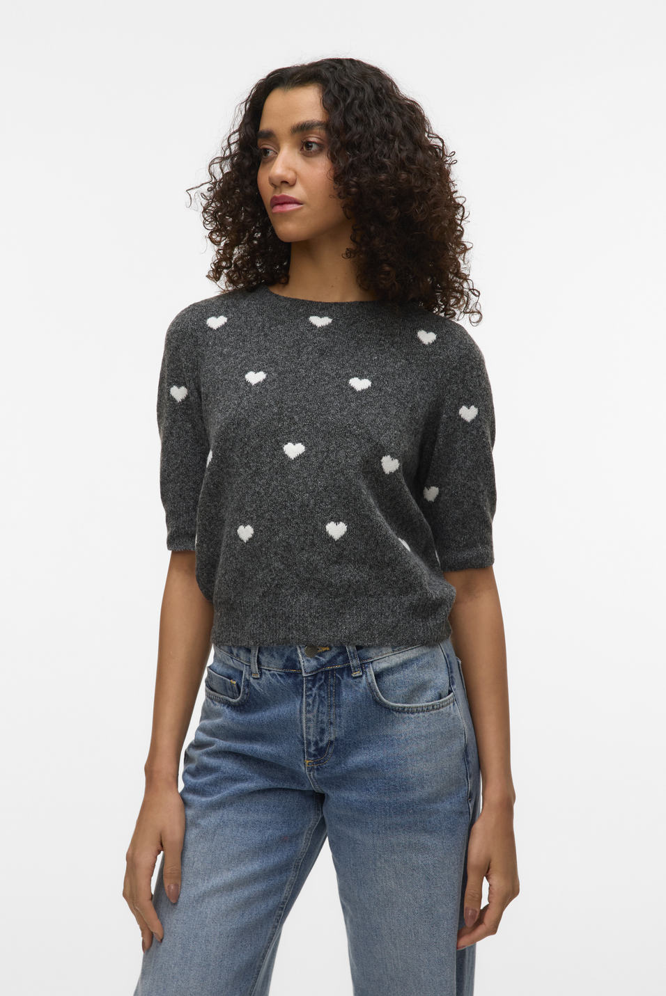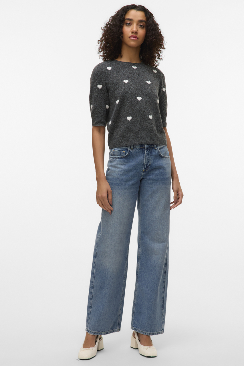 Deze stijlvolle dark grey melange trui van Vero Moda is een charmante aanvulling op jouw garderobe. Gemaakt van hoogwaardige knitwear, biedt het comfort met een vleugje elegantie. De grafische hartjesprint op de donkere achtergrond geeft de trui een speelse, yet verfijnde uitstraling. Met een regular fit pasvorm en een ronde hals is het een veelzijdig kledingstuk voor verschillende gelegenheden. De korte mouwen maken het perfect voor de lente, of je nu een middag in het park plant of gewoon een casual dagje uit. Dankzij het tijdloze design is deze Vero Moda trui gemakkelijk te combineren met verschillende stijlen. Draag hem met een goed zittende jean voor een nonchalante look of combineer met een rok voor een iets gekledere outfit. De normale lengte zorgt ervoor dat hij flatteus valt bij verschillende lichaamstypes, terwijl de zachte stof comfort garandeert gedurende de dag. Of je nu thuis bent, aan het werk of een dagje uit met vrienden, deze trui is een geweldige keuze voor elke gelegenheid.
