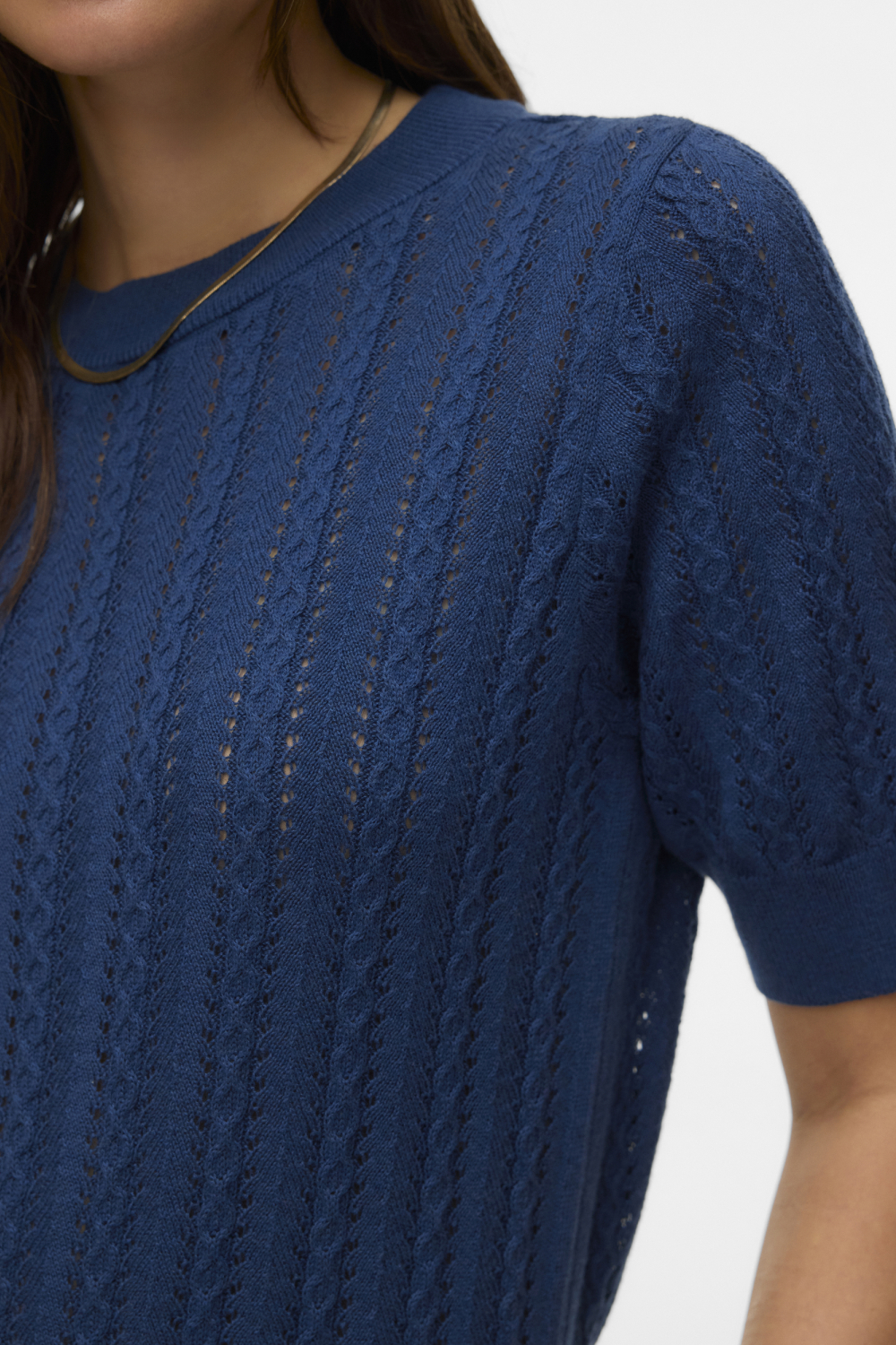 Deze casual trui van Vero Moda in de kleur Dark Denim biedt een fris lentegevoel met zijn korte mouwen en regular fit. Gemaakt voor dames, combineert deze trui stijl en comfort met een ronde hals en een speels kabelpatroon. De hoogwaardige materialen versterken het casual karakter, terwijl de normale lengte zorgt voor een goede match met verschillende soorten broeken of rokken. Met zijn tijdloze ontwerp is deze Vero Moda trui een veelzijdige aanwinst voor je garderobe. Perfect voor een relaxte dag op kantoor of een informele bijeenkomst, biedt het de ideale combinatie van elegantie en gemak. De subtiele en verfijnde textuur voegt een extra dimensie toe aan je outfit, waardoor deze trui niet alleen een praktische, maar ook een stijlvolle keuze is voor elke vrouw die prijs stelt op kwaliteit en mode.