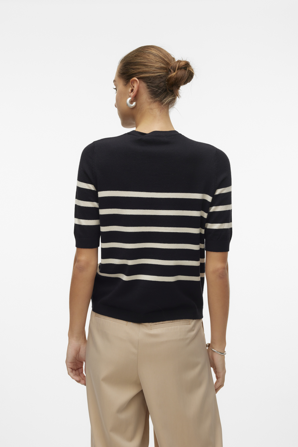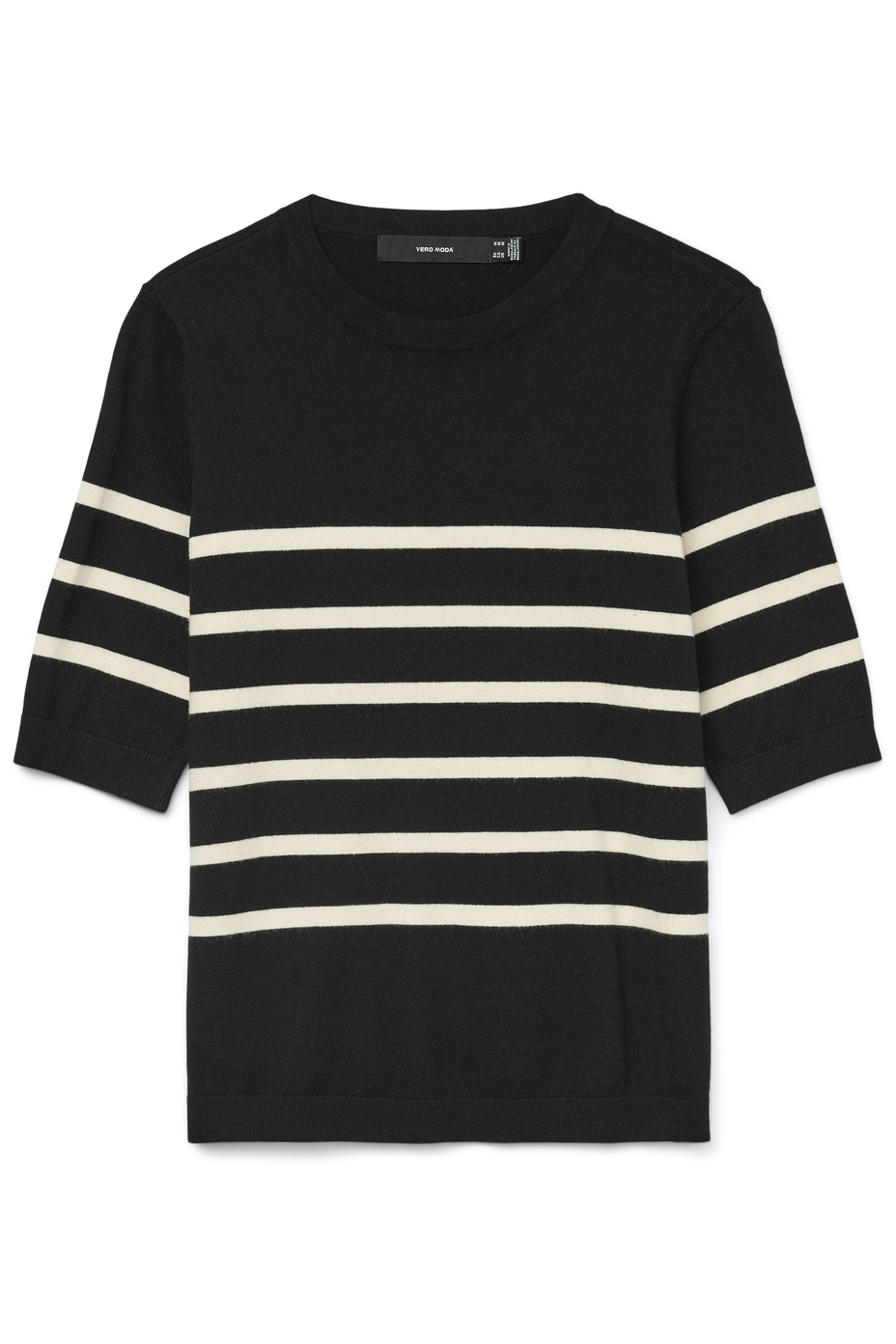 Deze stijlvolle Vero Moda trui combineert comfort en elegantie op een natuurlijke manier. Het zwarte knitwear ontwerp met lichte strepen voegt een speelse touch toe aan je outfit. Met een ronde halslijn en korte mouwen heeft de trui een regular fit die zorgt voor een ongecompliceerde en relaxte uitstraling. De contrasterende strepen geven deze trui een tijdloze charme, waardoor hij veelzijdig te combineren is met je garderobe. Perfect voor zowel casual dagen als informele afspraken, deze Vero Moda trui is een betrouwbare keuze. Combineer hem met een lichte pantalon voor een chique uitstraling, of draag hem met je favoriete jeans voor een relaxte look. De normale lengte maakt het eenvoudig om de trui in of over je broek te dragen, afhankelijk van je voorkeur. Of het nu een frisse lentedag is of een relaxte middag thuis, deze trui biedt de stijl en het comfort die je zoekt.