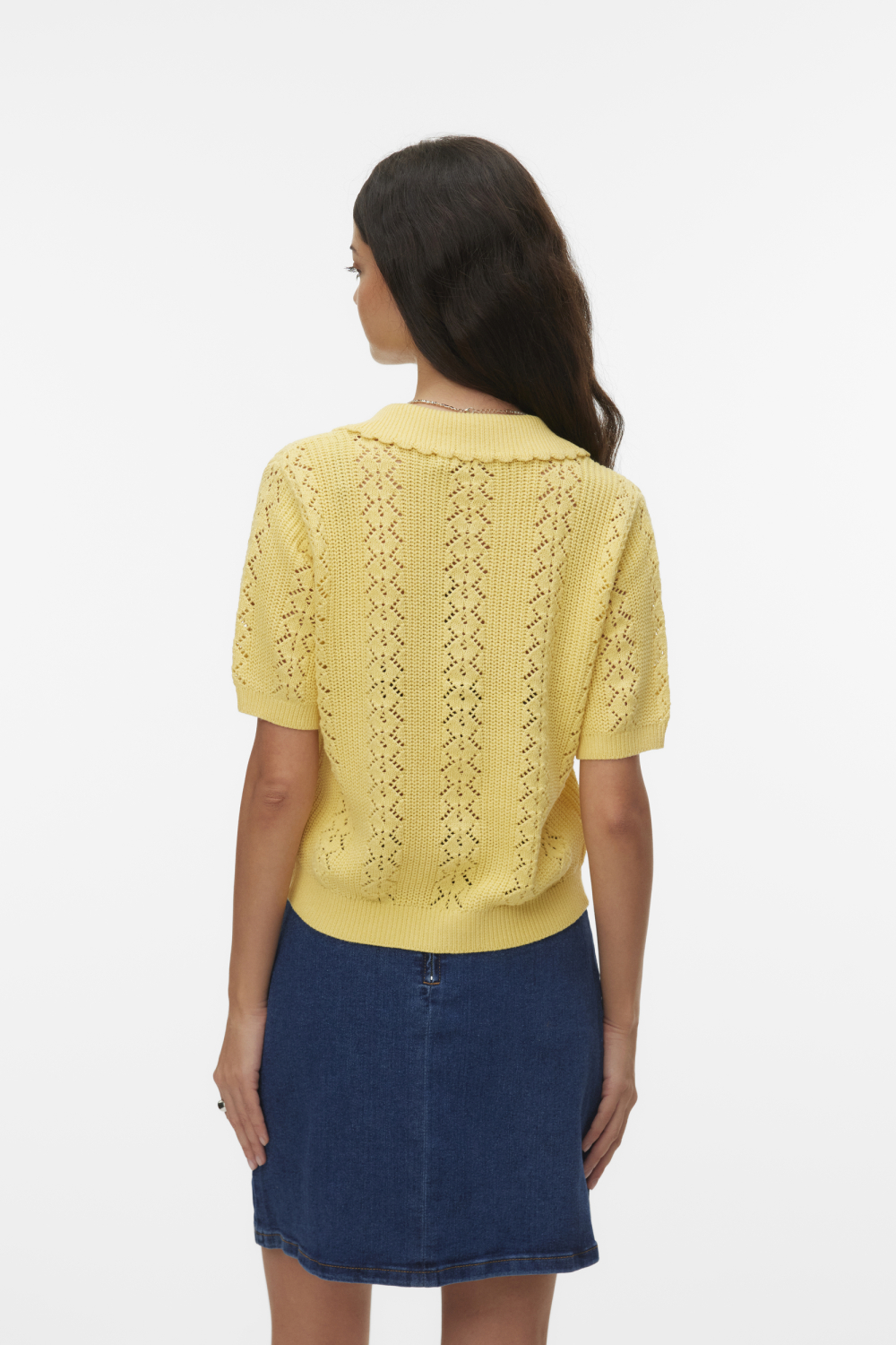 Dit stijlvolle ajour vest van Vero Moda is een elegante keuze voor de lente. Met zijn delicate opengewerkte patroon en frisse gele tint, biedt deze knitwear een modieuze en toch comfortabele optie voor elke dag. De regular fit zorgt voor een ontspannen uitstraling, terwijl de korte mouwen en de puntkraag het vest een speelse touch geven. Het vest is vervaardigd uit 60% gerecycled katoen en 40% gerecycled polyester, wat niet alleen zacht aanvoelt, maar ook duurzaam is. De knoopsluiting voegt een klassiek detail toe, waardoor je dit vest makkelijk kunt combineren met een jeans voor een casual look, of met een rok voor een meer formele gelegenheid. Dit veelzijdige vest is perfect voor die milde lentedagen waarop je iets lichts maar stijlvols wilt dragen. Dankzij de normale lengte valt het mooi op de heupen, en door het ademende materiaal blijf je comfortabel, ongeacht de setting. Of je nu naar een lunch met vrienden gaat of een ontspannen dag hebt op kantoor, dit Vero Moda vest is een uitstekende toevoeging aan je garderobe.