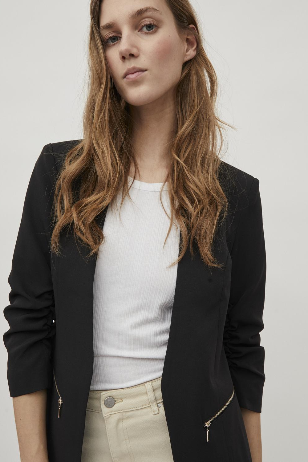 De zwarte blazer van Vila is een prachtige aanvulling op elke damesgarderobe. Deze blazer, gemaakt van 95% polyester en 5% elastan, biedt een comfortabele regular fit die perfect is voor alledaags gebruik. Met zijn verfijnde uitstraling en normaal vallende lengte past hij zowel bij informele als meer formele gelegenheden. De blazer heeft subtiele ritszakken aan de voorkant, wat niet alleen praktisch is, maar ook een modern accent geeft aan het ontwerp. De mouwen zijn 3/4 van lengte, wat een eigentijdse twist toevoegt aan je outfit.