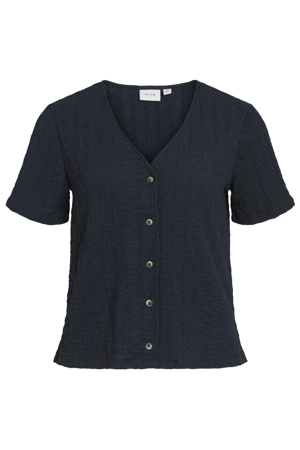 Deze elegante blouse van Vila is een verfijnde toevoeging aan jouw lentegarderobe. Gemaakt van 95% gerecycled polyester en 5% elastaan, biedt de stof een lichte stretch voor optimaal comfort. De structuur van de blouse geeft een subtiele textuur die bijdraagt aan een stijlvolle uitstraling. De V-hals en de knoopsluiting aan de voorkant zorgen voor een klassieke, maar moderne look. Dankzij de regular fit en normale lengte is deze blouse ideaal voor verschillende gelegenheden, van een casual dag op kantoor tot een ontspannen brunch met vrienden. De korte mouwen maken het een perfecte keuze voor de warmere maanden. De diepblauwe tint is eenvoudig te combineren met diverse onderstukken, zoals een lichte jeans of een elegante rok. Ervaar de veelzijdigheid en draagbaarheid van deze stijlvolle Vila blouse in elke situatie.