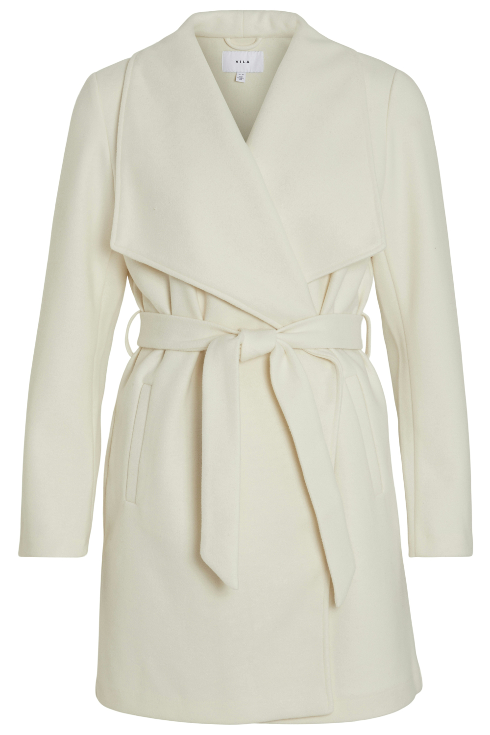 Halflange tussenjas van Vila met lange mouwen en een reverskraag. De jas is een openvallend model en sluit met een strikkoord. Daarnaast heeft dit model steekzakken aan de voorkant.