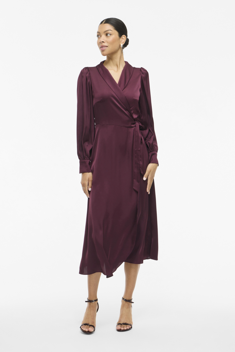 Deze prachtige jurk van Vila in de kleur fig is een elegante keuze voor elke feestelijke gelegenheid. De overslaghalslijn en het strikkoord geven de jurk een verfijnde uitstraling, terwijl de lange mouwen zorgen voor een chique look. Gemaakt van 100% polyester, biedt de stof een lichte glans die bijdraagt aan de feestelijke stijl van het kledingstuk. De 7/8 lengte valt mooi om het lichaam en zorgt voor een elegante beweging terwijl je loopt.