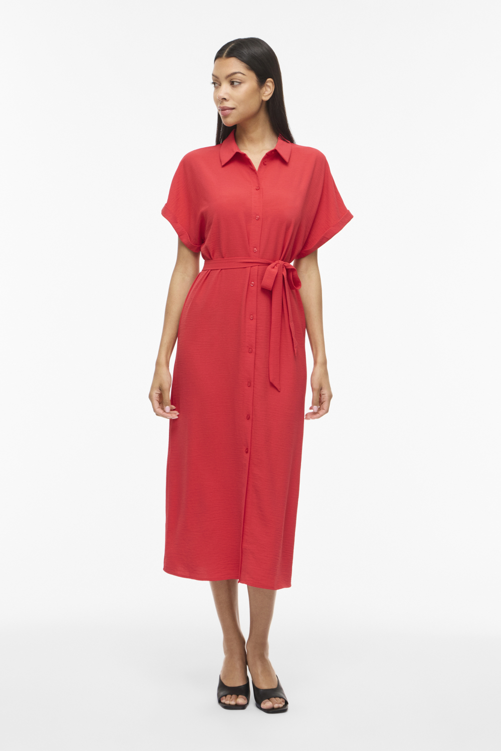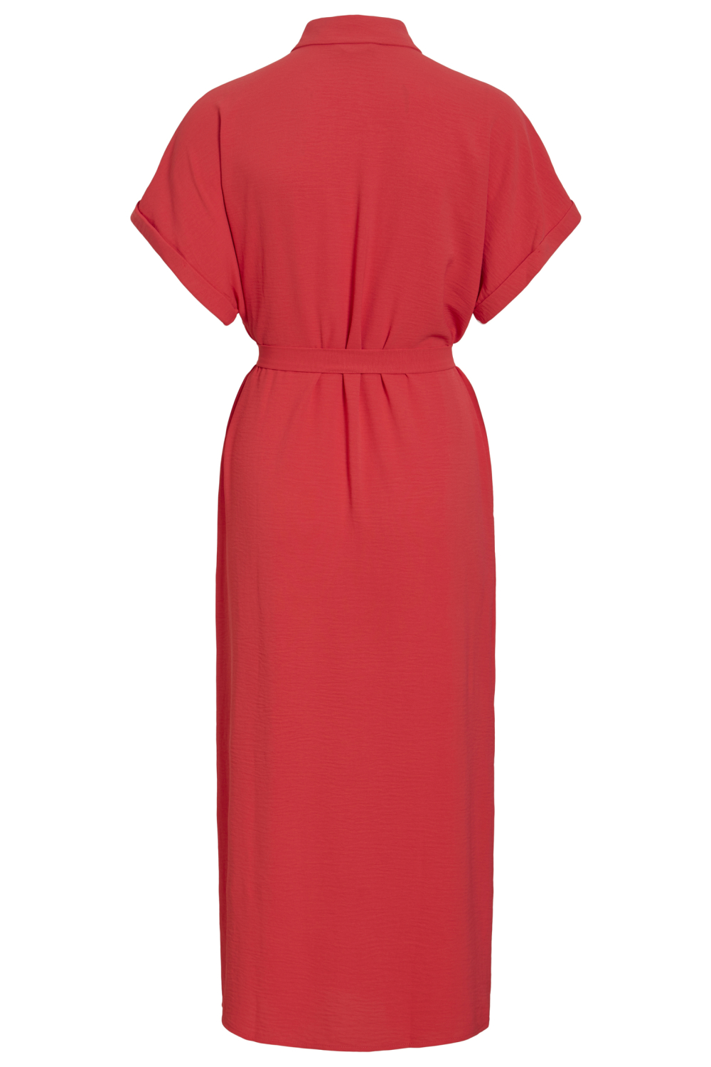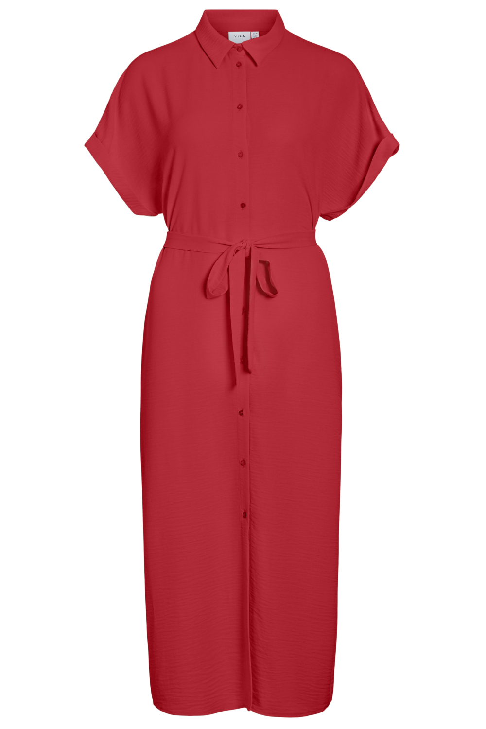 De korte mouwen en de soepele stof maken deze jurk luchtig en perfect voor warmer weer. Het subtiele striklint in de taille biedt de mogelijkheid om je silhouet op een flatterende manier te accentueren. Deze Vila jurk is veelzijdig in zijn eenvoud; hij kan gemakkelijk gecombineerd worden met zowel elegante hakken als casual sneakers. Of je nu een wandeling maakt door de stad of geniet van een ontspannen middag in het park, met deze jurk ben je verzekerd van een stijlvolle uitstraling.