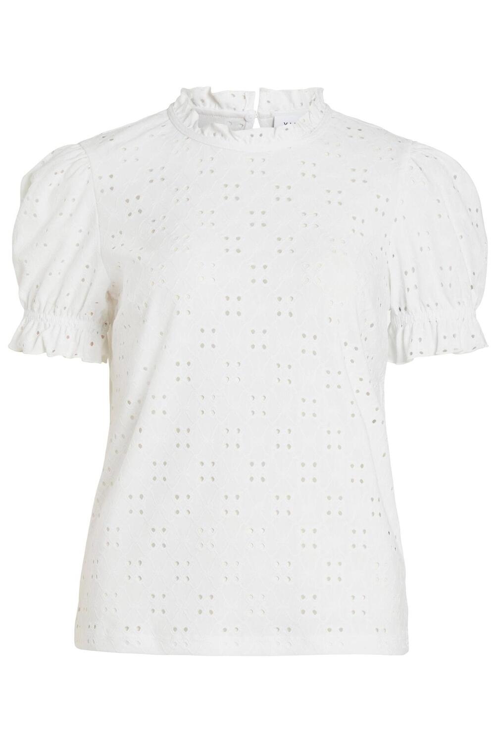 Dit stijlvolle Vila T-shirt in de kleur optical snow is een subtiele blikvanger in je garderobe. Met een regular pasvorm en een ronde hals biedt het een casual maar verfijnde uitstraling. De korte mouwen zijn voorzien van speelse ruches, waardoor het shirt een vrouwelijke touch krijgt. Het ajourpatroon zorgt voor een modieuze en luchtige look, ideaal voor zowel dagelijks gebruik als voor speciale gelegenheden. Gemaakt van 95% gerecycled polyester en 5% elastan, voelt deze top niet alleen comfortabel aan, maar is hij ook een duurzame keuze.