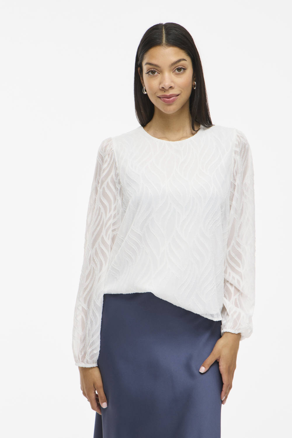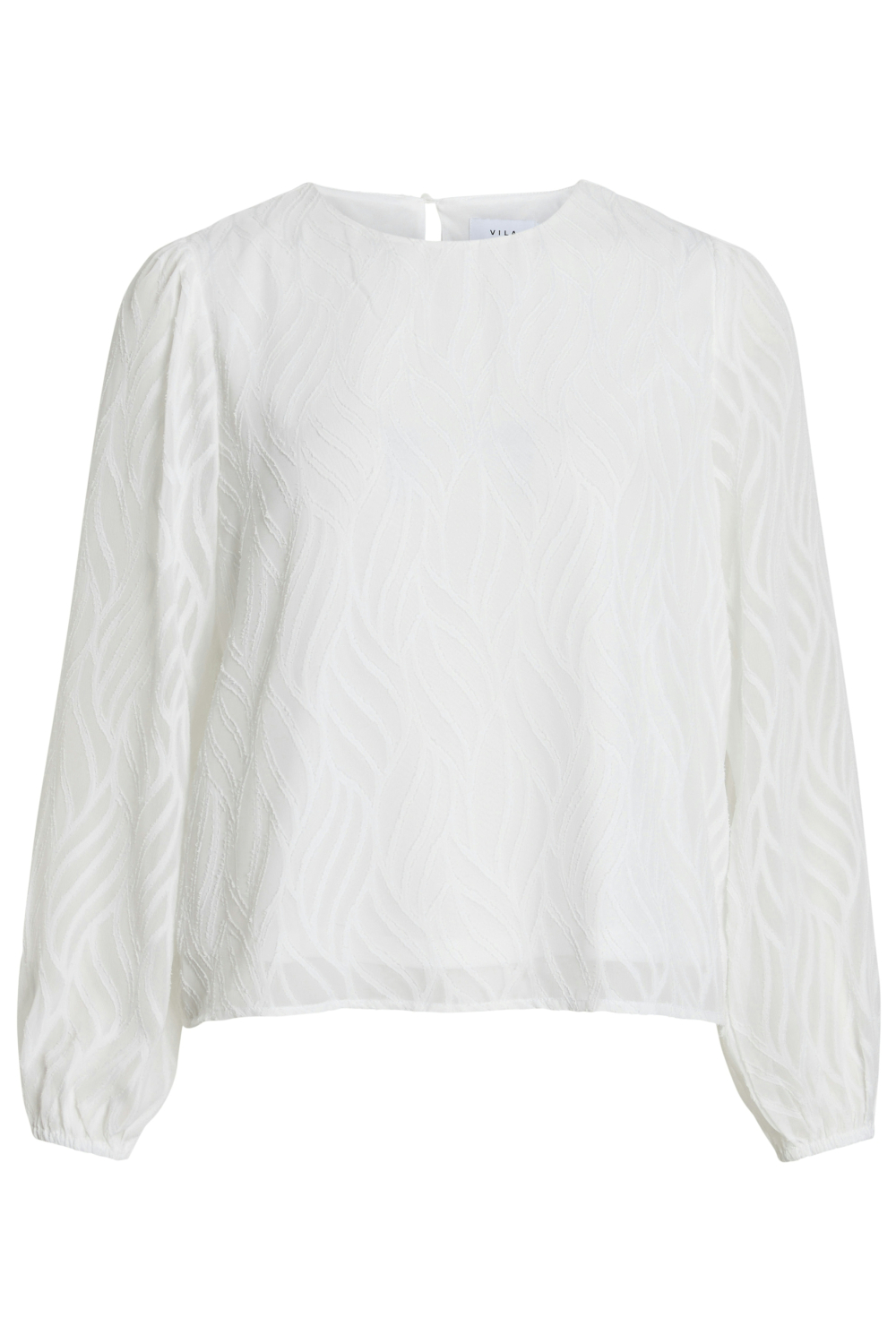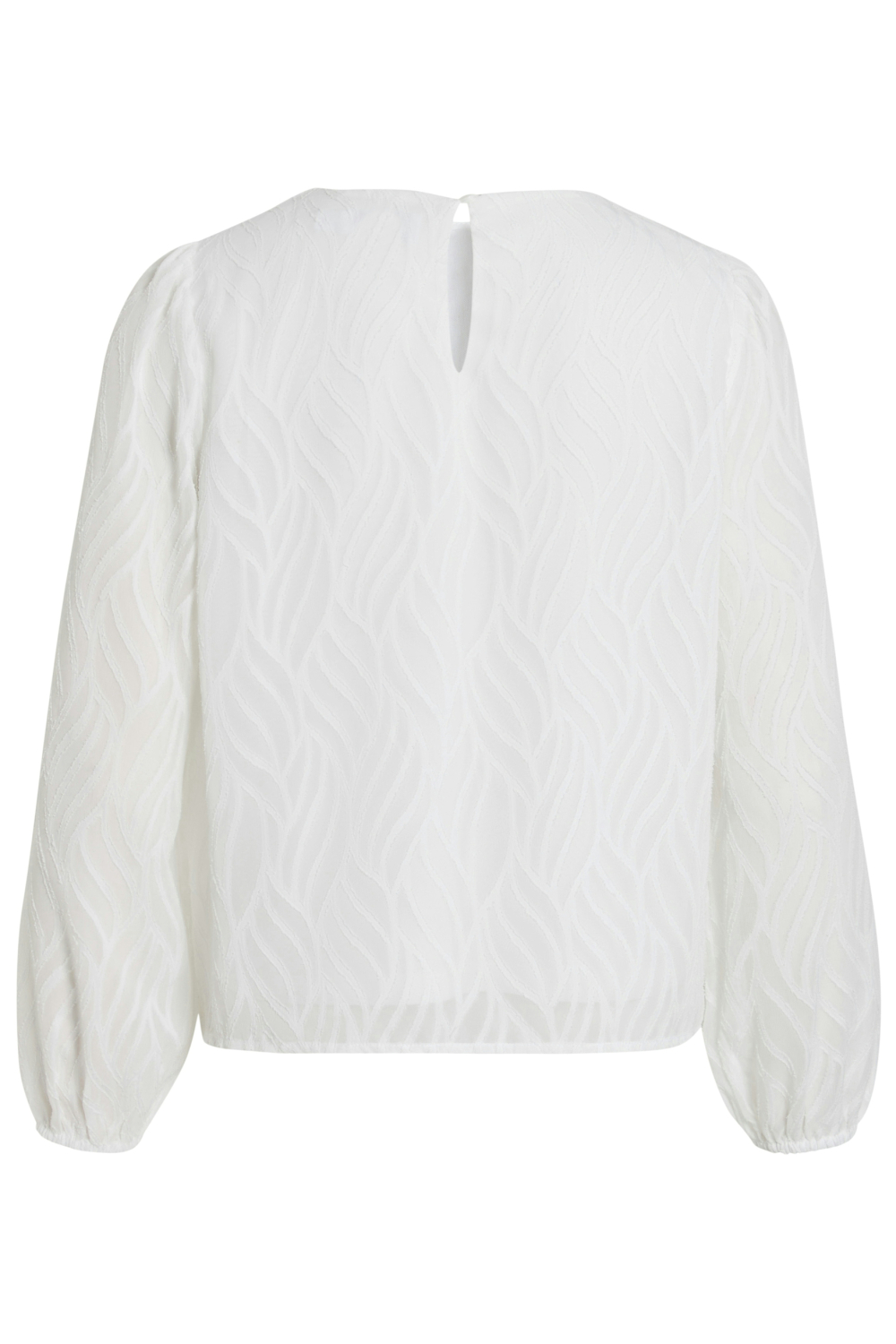 Deze elegante blouse van Vila, uitgevoerd in de kleur Cloud Dancer, is een verfijnde toevoeging aan je herfstgarderobe. De blouse heeft een prachtige textuur met een subtiel patroon, wat zorgt voor een interessante twist aan een klassiek ontwerp. Met de lange mouwen en de ronde hals biedt dit kledingstuk zowel stijl als comfort. De lichte doorzichtigheid van het materiaal geeft een speels accent, terwijl de polyester voering zorgt voor een gestructureerd geheel.
