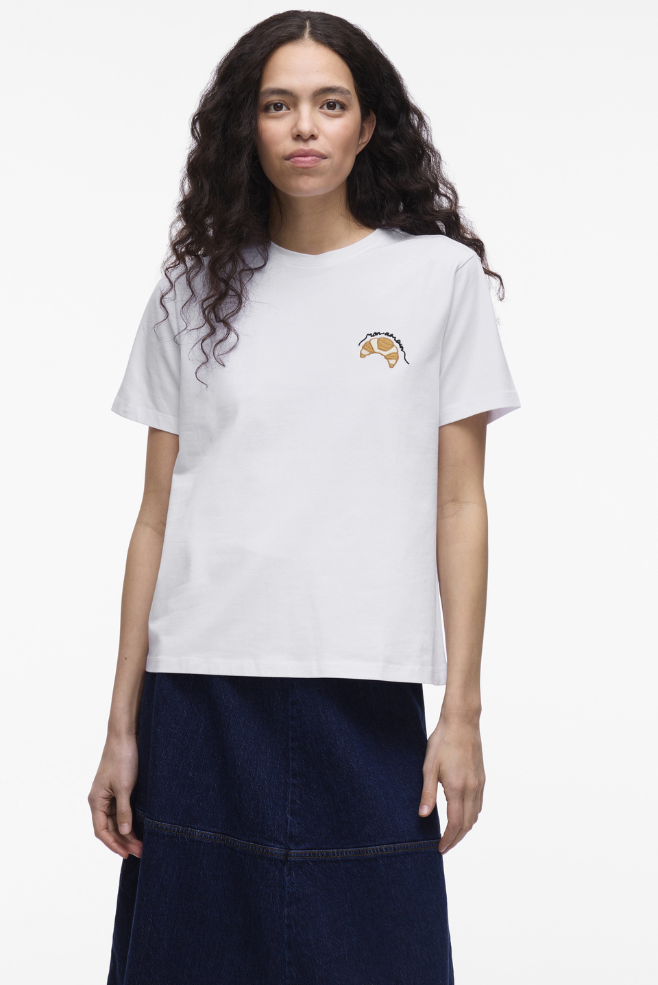 Dit grafische T-shirt van Vila is een frisse aanvulling op je zomergarderobe. Het T-shirt heeft een ronde hals en een comfortabele regular fit die beweging moeiteloos mogelijk maakt. Op de borst prijkt een speelse croissantprint die voor een subtiel statement zorgt. De combinatie van 96% katoen en 4% elastan biedt een zacht en ademend gevoel, ideaal voor warme dagen. Het heldere, witte T-shirt is perfect voor casual gelegenheden en laat zich eenvoudig combineren met een jeans of een luchtige rok. Dankzij de korte mouwen is het T-shirt zeer geschikt voor zomerse uitstapjes, zoals een wandeling in het park of een dagje strand. Met zijn duurzame materiaalkeuze kies je voor zowel stijl als verantwoording. Voeg een beetje fun toe aan je dagelijkse outfits met dit veelzijdige en comfortabele T-shirt van Vila.