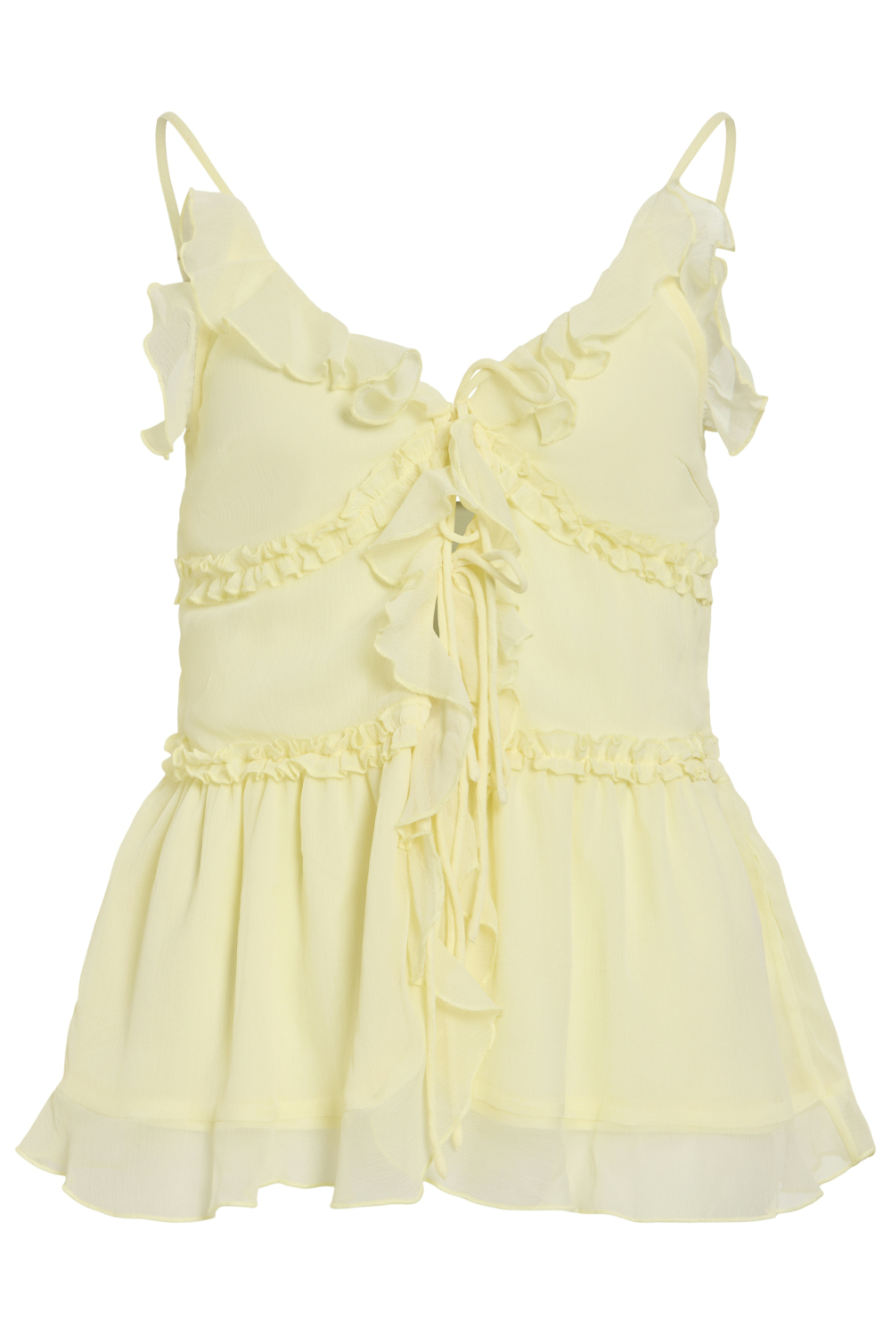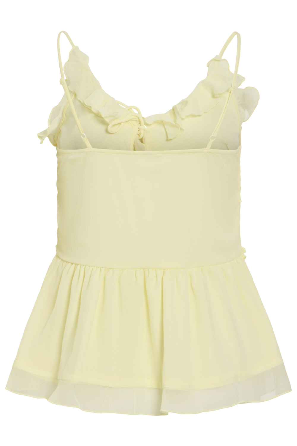 Deze casual top van Vila in Pastel Yellow is een stijlvolle toevoeging aan je zomergarderobe. Met een lichte en luchtige uitstraling dankzij de 100% gerecycled polyester, voel je je de hele dag comfortabel. De top heeft een charmante V-hals die samenkomt met subtiele spaghettibandjes voor een speelse look. Het strikkoord aan de voorkant geeft je de mogelijkheid om de pasvorm naar wens aan te passen, terwijl de ruches rondom voor een romantische toets zorgen. De reguliere pasvorm en normale lengte maken deze top veelzijdig en perfect voor verschillende gelegenheden. Of je nu een dag op het strand doorbrengt of een informele bijeenkomst hebt, deze top combineert moeiteloos met je favoriete jeans of een luchtige rok. De zachte pastelgele kleur voegt een vleugje frisheid toe aan elke outfit, waardoor je altijd klaar bent voor een zonnige dag buiten. Kies voor comfort en stijl met deze duurzame en modieuze Vila top.