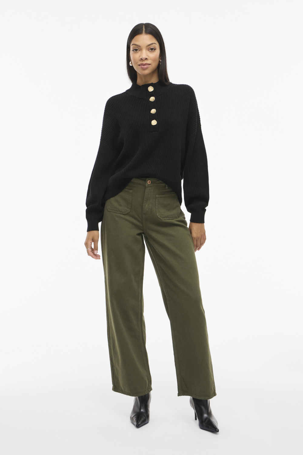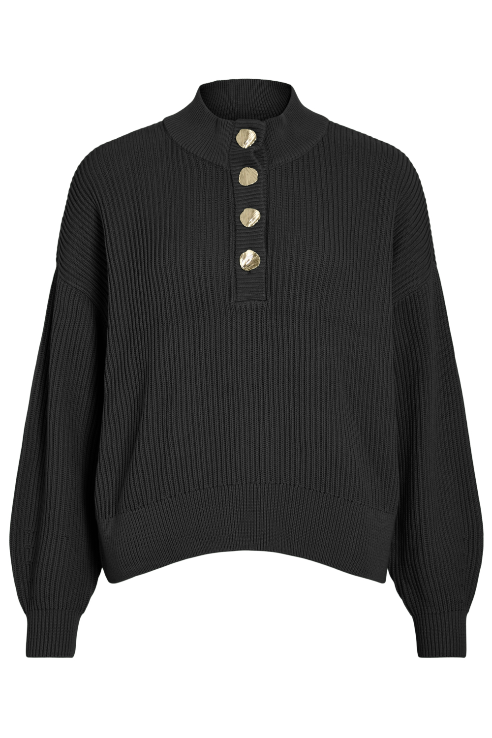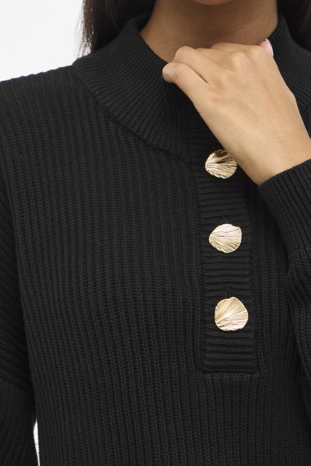 Deze comfortabele trui van Vila in de kleur Black Beauty is een ideale keuze voor de wintermaanden. Gemaakt van 100% katoen, biedt de trui zacht draagcomfort met een ademende stof. De regular fit pasvorm maakt het geschikt voor dagelijks gebruik, terwijl de high neck en lange mouwen extra warmte geven op koudere dagen. De trui heeft een opvallend ontwerp met mooie knopen die subtiele elegantie toevoegen aan de voorkant en zorgen voor een speels accent.