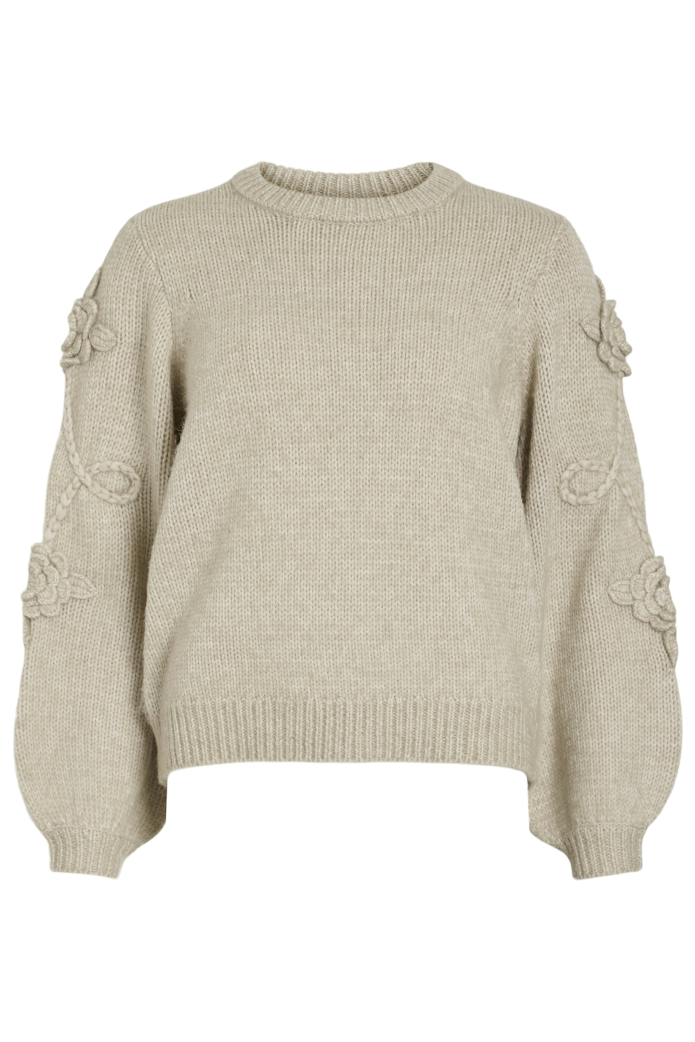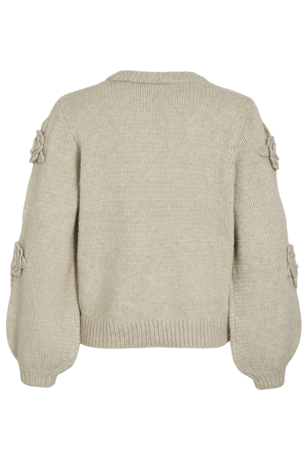 Deze verfijnde cementkleurige Vila trui is een stijlvolle aanvulling op je herfstgarderobe. Met zijn regular fit en ronde hals biedt de trui een comfortabele pasvorm die ideaal is voor elke casual gelegenheid. De lange mouwen zijn voorzien van prachtige driedimensionale bloemenapplicaties, die een unieke en elegante uitstraling geven aan deze knitwear. Het structuurpatroon van de trui voegt een subtiele charme toe en maakt het gemakkelijk te combineren met verschillende stijlen en kleuren.