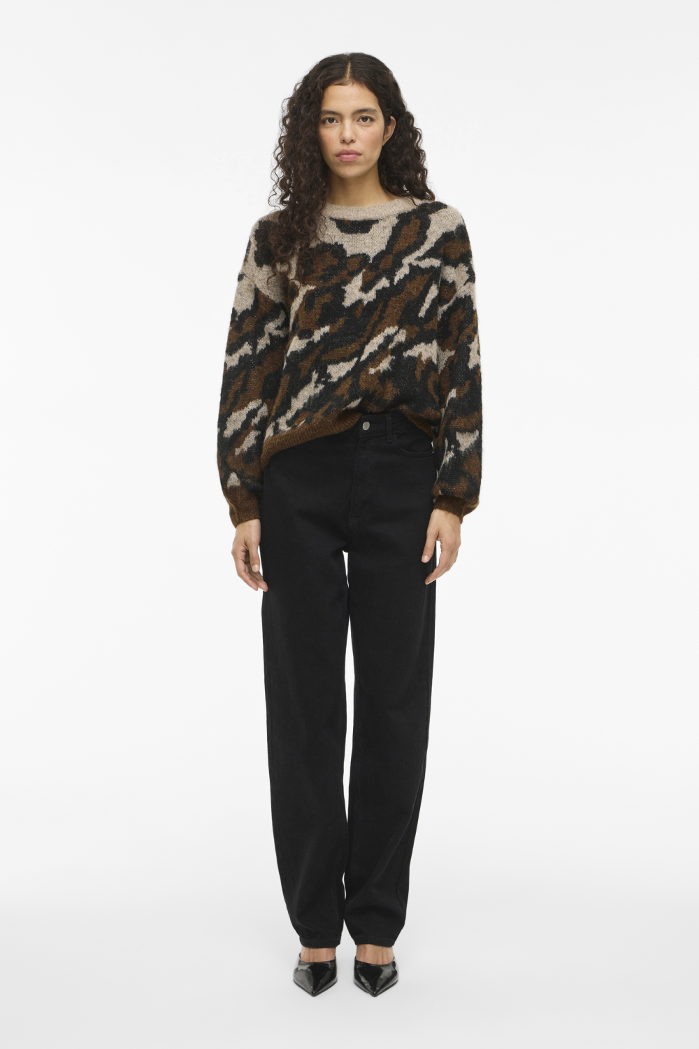 Deze grafische damestrui van Vila is een veelzijdig kledingstuk dat gemakkelijk in je herfstgarderobe past. De trui, met een opvallend patroon in warme tinten zoals bruin en beige, heeft een ronde hals en een regular fit pasvorm. Deze combinatie zorgt voor een comfortabele en goed aansluitende look. De zachte knitwear stof voelt fijn aan en houdt je warm tijdens de koelere dagen. Perfect voor een relaxte dag in de stad of een gezellige avond thuis. Met zijn normale lengte en lange mouwen biedt de Vila trui zowel flexibiliteit als stijl. Combineer deze trui bijvoorbeeld met een zwarte jeans voor een casual outfit, of draag hem over een nette broek naar je werk. Het duurzame karakter van het kledingstuk maakt het een verantwoorde keuze voor de modebewuste vrouw van nu. Dankzij het veelzijdige ontwerp is deze trui zowel geschikt voor informele als meer formele gelegenheden, waardoor je hem keer op keer uit de kast zult pakken.
