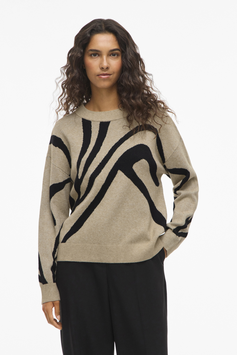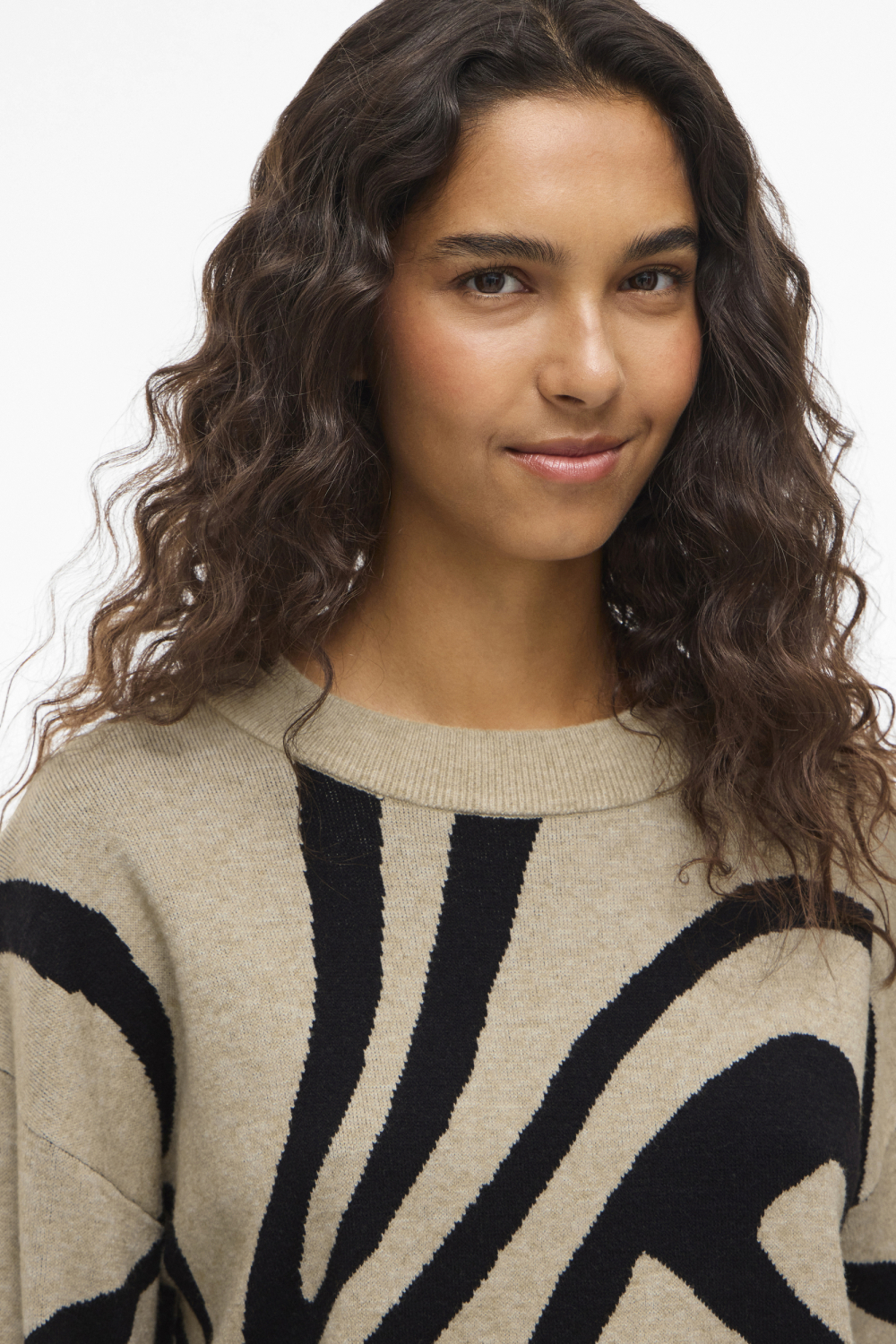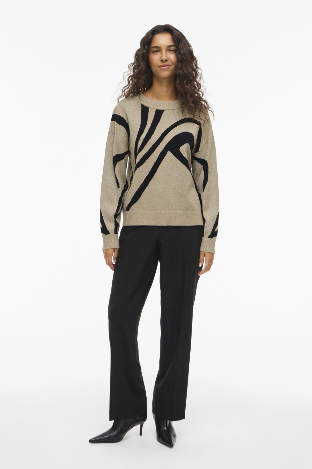 Deze gemêleerde damestrui van Vila is een veelzijdige toevoeging aan jouw garderobe. De trui heeft een opvallende grafische print in zwart op een zandkleurige achtergrond, wat zorgt voor een unieke look. Met zijn ronde hals en lange mouwen biedt de trui zowel comfort als stijl. De regular fit pasvorm zorgt ervoor dat de trui losjes valt, wat perfect is voor een casual uitstraling. Met zijn basisontwerp is deze trui ideaal voor dagelijks gebruik, maar ook geschikt voor informele bijeenkomsten met vrienden of familie. De Vila trui is een uitstekende keuze voor elk seizoen door zijn normale lengte en comfortabele stof. Het gemêleerde patroon geeft een subtiel maar trendy accent aan elke outfit. Combineer deze trui eenvoudig met een donkere jeans voor een relaxte look, of draag hem boven een nette broek voor een meer verfijnde stijl. Of je nu onderweg bent naar je werk of een ontspannen weekend voor de boeg hebt, met deze trui ben je altijd stijlvol gekleed.
