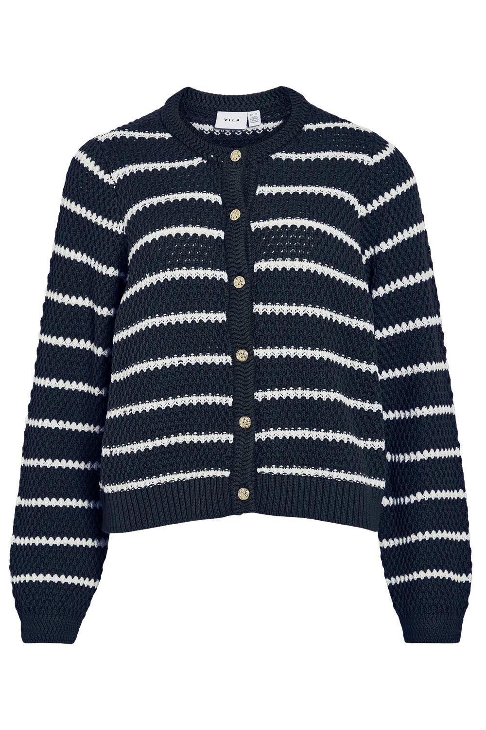 Deze elegante navy blazer en cloud dancer gestreepte vest van Vila is een stijlvolle aanvulling voor je lente garderobe. Gemaakt van 100% organisch katoen, biedt het een zachte en comfortabele pasvorm die ideaal is voor frisse lentedagen. Het vest heeft een knoopsluiting en een ronde hals, wat zorgt voor een klassieke uitstraling. Met de stijlvolle structuur en de opvallende gouden knopen geef je elke outfit een verfijnde touch.