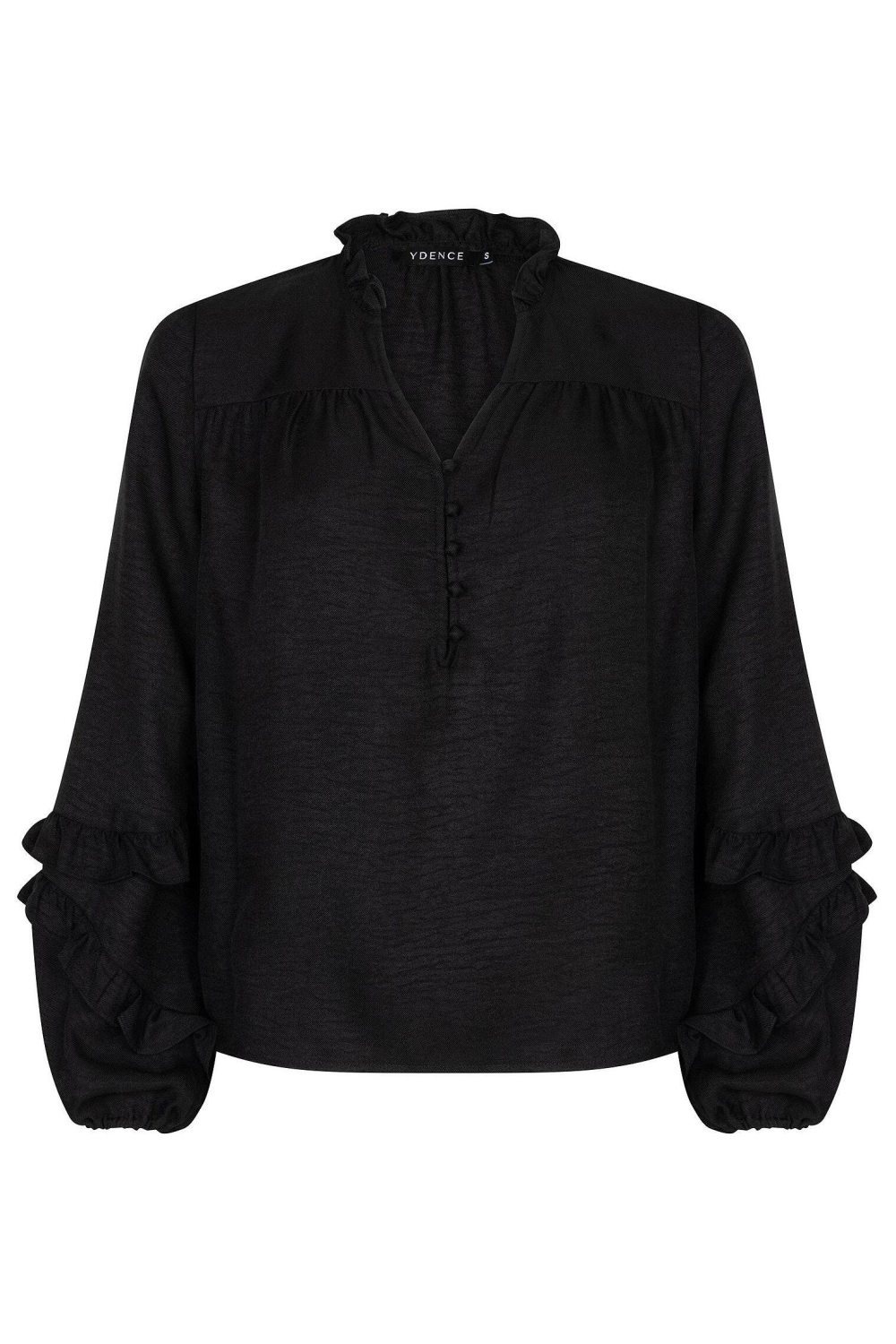 Deze elegante zwarte blouse van Ydence is een veelzijdige toevoeging aan je wintergarderobe. Met zijn verfijnde V-hals en de stijlvolle knoopsluiting aan de voorzijde, biedt deze blouse een tijdloze uitstraling die past bij diverse gelegenheden. De lange mouwen zijn voorzien van subtiele ruches, wat een speelse en vrouwelijke touch aan het ontwerp geeft. Het materiaal van 97% polyester en 3% elastaan zorgt voor een comfortabele pasvorm en een lichte stretch, waardoor de blouse perfect aansluit zonder in te boeten op comfort.